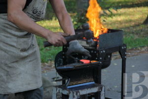 …Искры ярче солнца. Вокруг меня шумит, разговаривает, поет и танцует парк, но удары молота по металлу заглушают все. Кузнец Денис Тучс специально приехал в Рязань, чтобы дать мастер-класс на благотворительном фестивале. Солнце клонится к закату, приходят и уходят зрители, а он продолжает ковать заготовку, придавая алому бруску форму цветка.