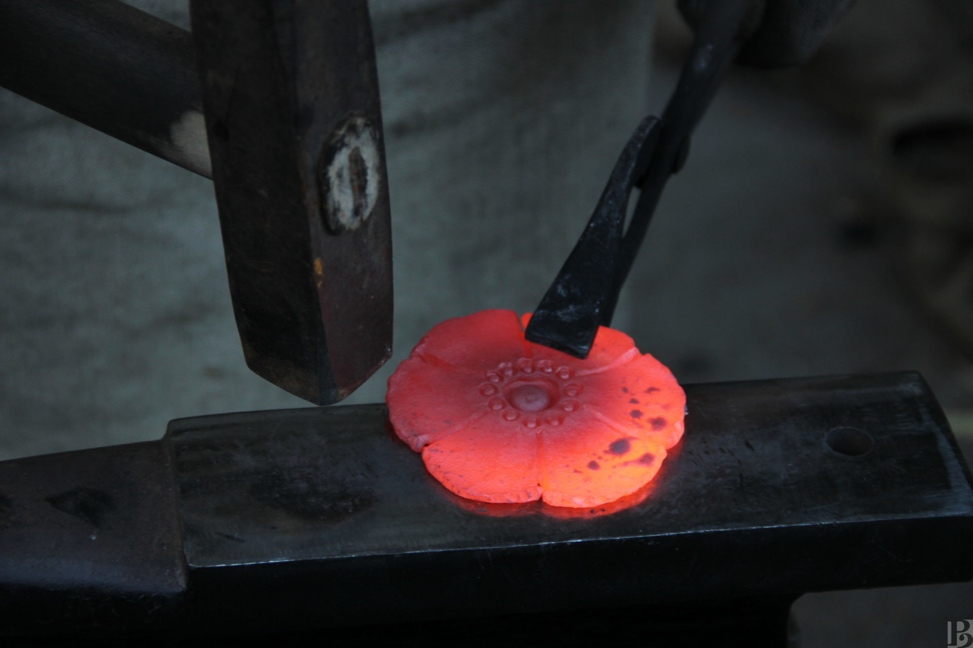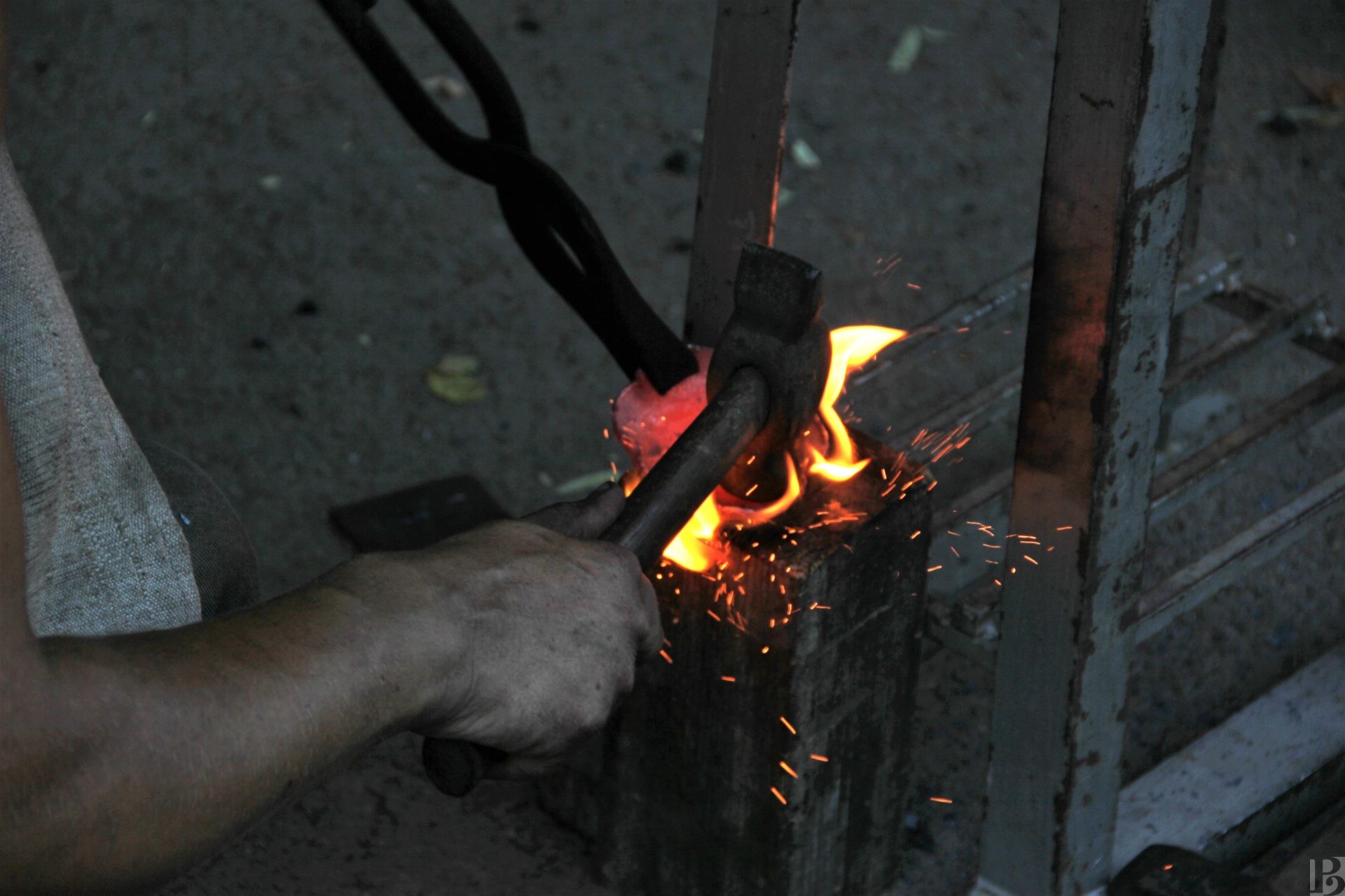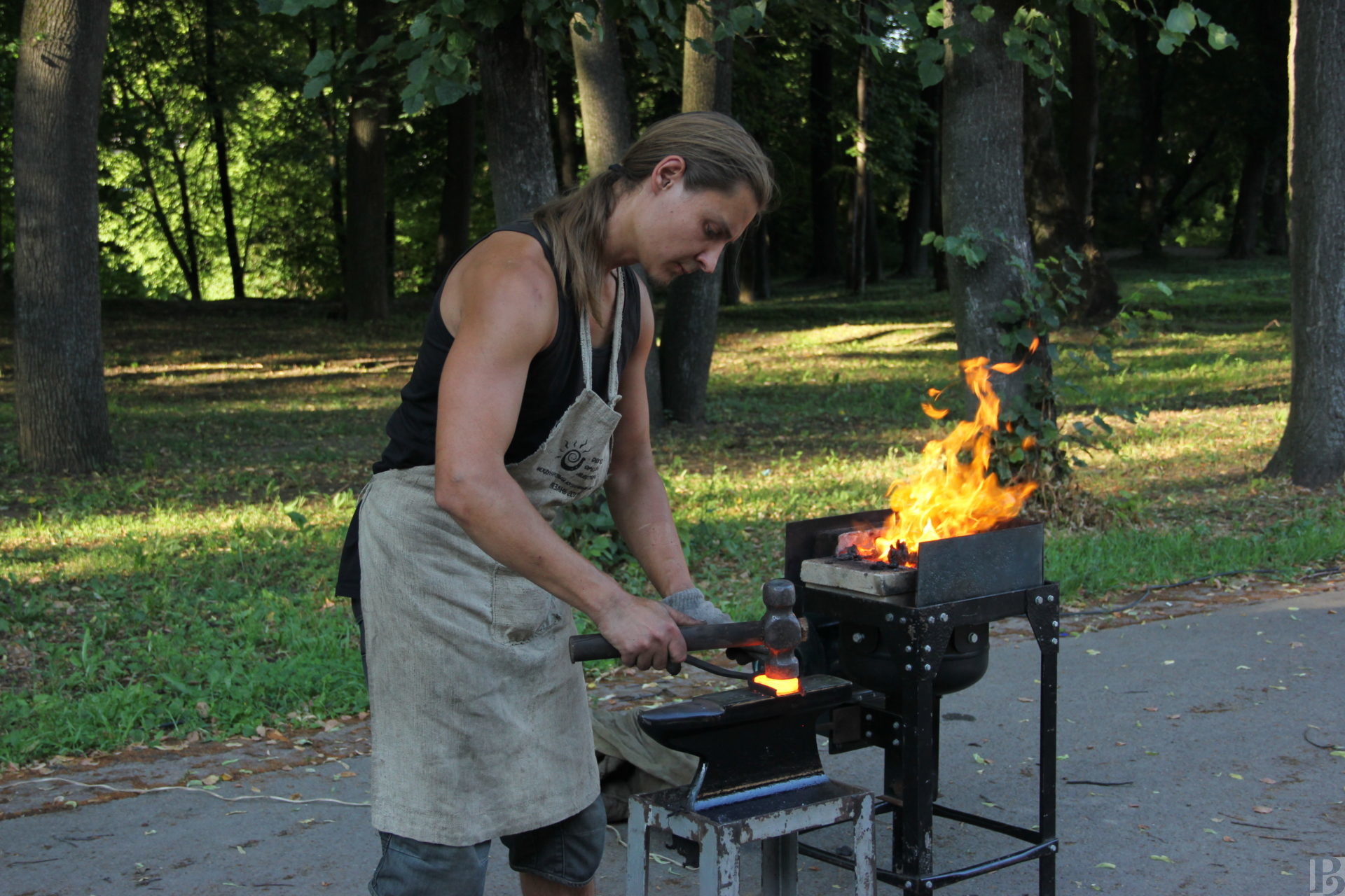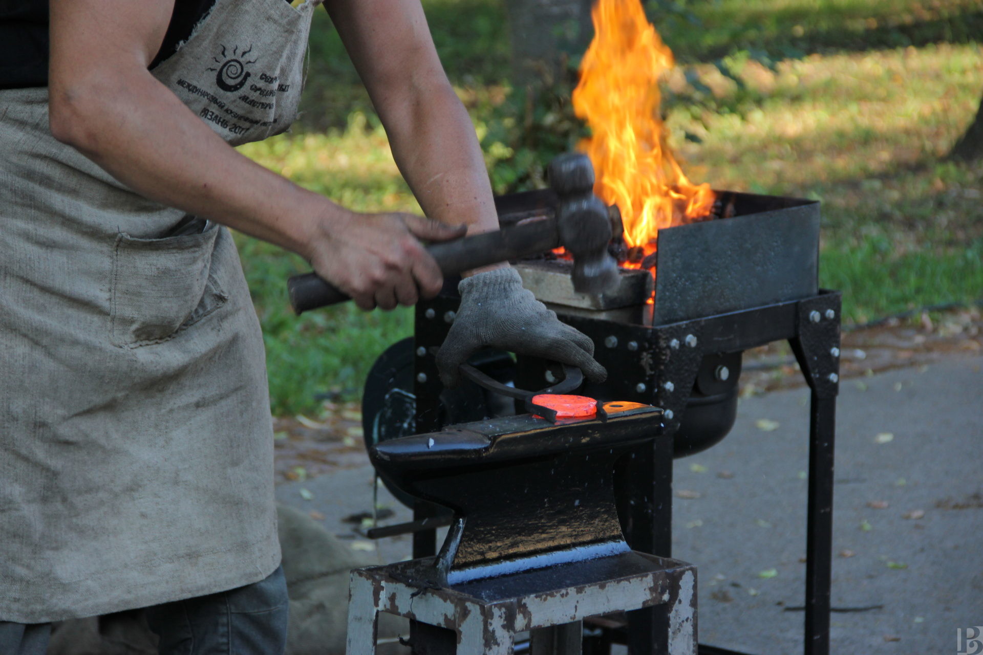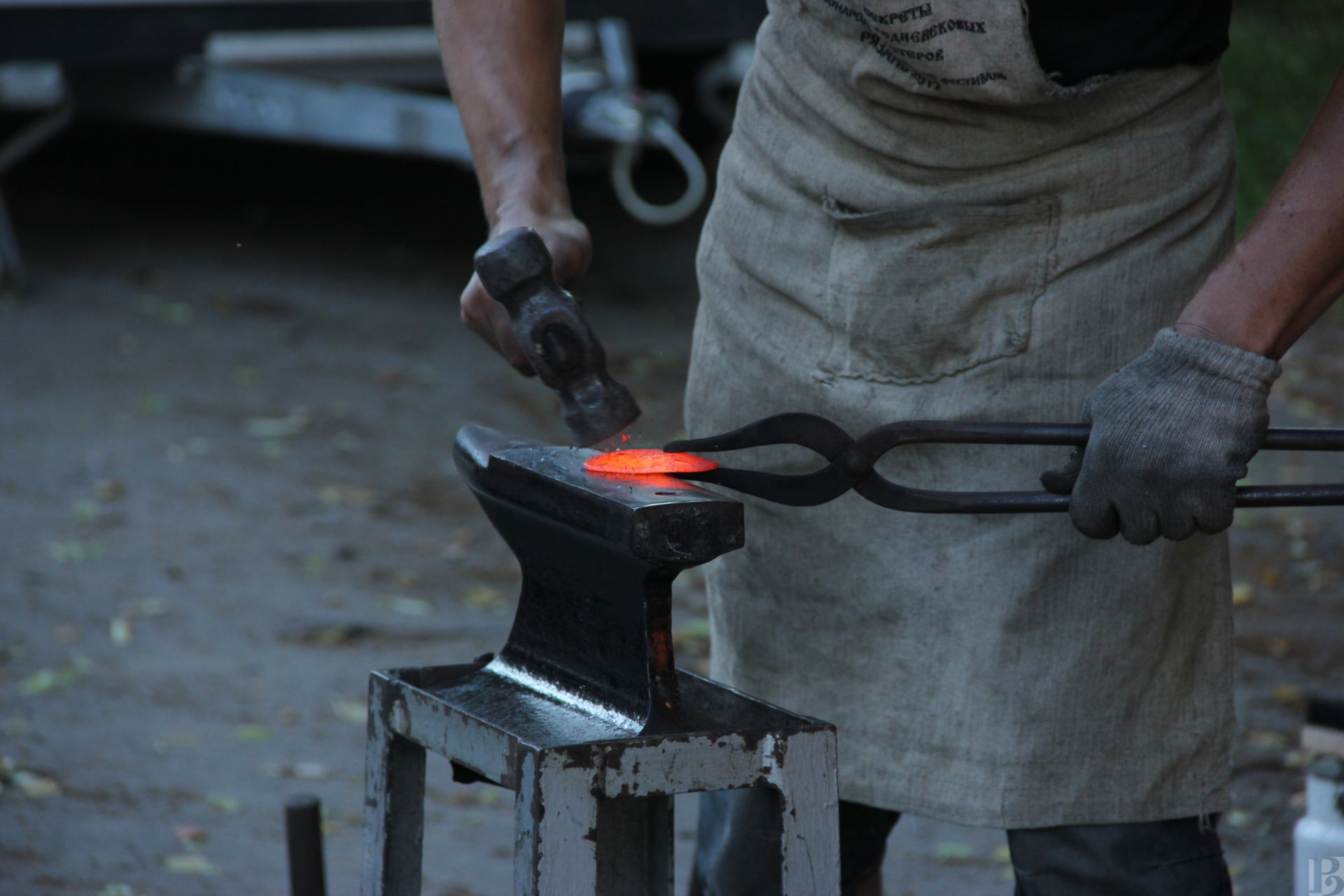 …Искры ярче солнца. Вокруг меня шумит, разговаривает, поет и танцует парк, но удары молота по металлу заглушают все. Кузнец Денис Тучс специально приехал в Рязань, чтобы дать мастер-класс на благотворительном фестивале. Солнце клонится к закату, приходят и уходят зрители, а он продолжает ковать заготовку, придавая алому бруску форму цветка.