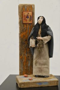 В экспозиции 14 авторских кукол, о каждой – информационная справка. Вот фигурка, изображающая русского иконописца Андрея Рублева. Его небесный взор устремлен ввысь, а в крошечных глиняных сосудах – аквамариновая краска. Рядом – созданный им образ святой Троицы. Неподалеку от него расположилась блаженная Любушка – рязанская святая. Знакомый каждому розовый платочек, нежная полуулыбка, в руках крест «Спаси и сохрани», а глаза, хотя и ясные, пронзительные, стремятся вверх – к Богу. Из той же серии блаженный Парамон – герой, созданный по мотивам жития Франциска Ассизского. В простой рубахе из мешковины застыл он, облепленный семью птицами, – в позе абсолютного благоговения. Каждая кукла для художницы особенная, но Парамон к тому же стал победителем международного конкурса «My Fairy Tale – 2020 – Моя сказка».
