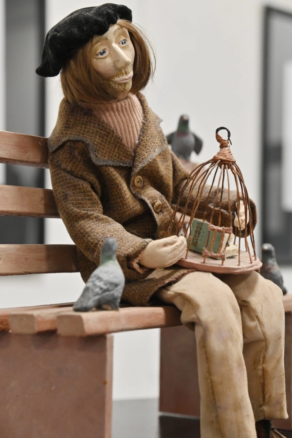В экспозиции 14 авторских кукол, о каждой – информационная справка. Вот фигурка, изображающая русского иконописца Андрея Рублева. Его небесный взор устремлен ввысь, а в крошечных глиняных сосудах – аквамариновая краска. Рядом – созданный им образ святой Троицы. Неподалеку от него расположилась блаженная Любушка – рязанская святая. Знакомый каждому розовый платочек, нежная полуулыбка, в руках крест «Спаси и сохрани», а глаза, хотя и ясные, пронзительные, стремятся вверх – к Богу. Из той же серии блаженный Парамон – герой, созданный по мотивам жития Франциска Ассизского. В простой рубахе из мешковины застыл он, облепленный семью птицами, – в позе абсолютного благоговения. Каждая кукла для художницы особенная, но Парамон к тому же стал победителем международного конкурса «My Fairy Tale – 2020 – Моя сказка».