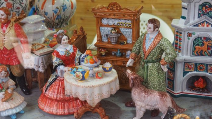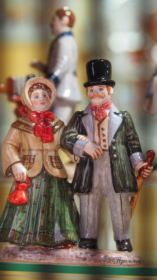 На витрине фигурки мещан, городских обывателей, купцов, дворян разыгрывают сюжеты XIX века. Бежит по мостовой разносчик газет в картузе, в подпоясанной рубахе. Гимназист кормит кусочком бублика дворовую собаку. Мама везет младенца в коляске. Городской фотограф с деревянной камерой-гармошкой в благодушном настроении приглашает прохожих сняться у него. А в домике на набережной купчиха пьет чай из самовара. Стол сервирован вазой с фруктами и диковинными по тем временам апельсинами. В голландской печке потрескивает огонь. Сама печка украшена поливными изразцами. Не теми ли, случайно, что висят тут же, в теремке у продавцов, с изображениями старинных и современных улиц Ярославля, с картинками из крестьянской жизни?