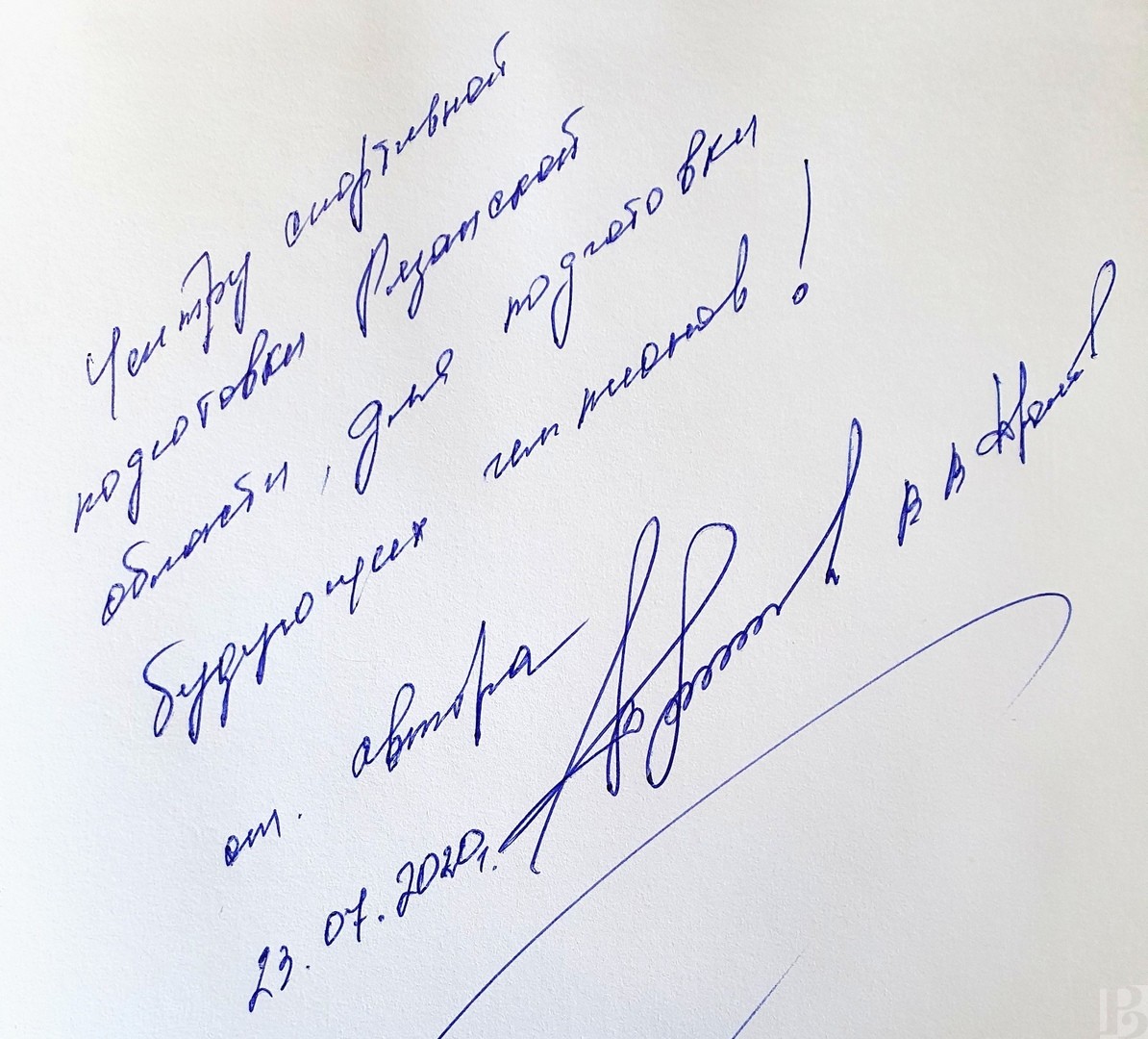На своей книге «Роль двигательной памяти в формировании технических навыков плавания у школьников» Владислав Викторович оставил автограф и пожелания Центру спортивной подготовки, в здании которого разместилась библиотека.