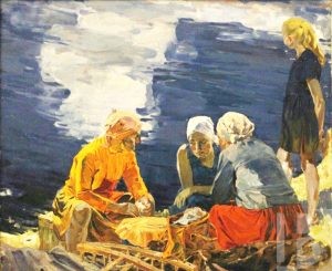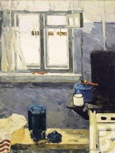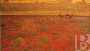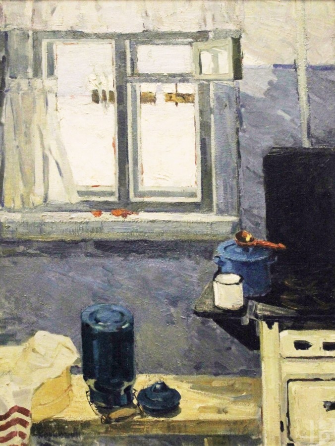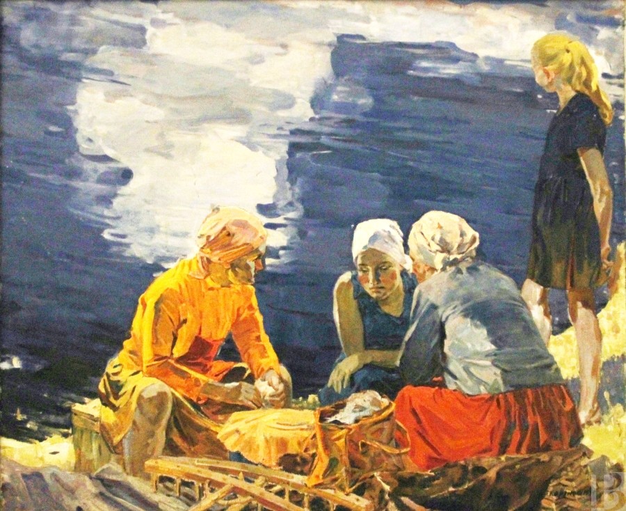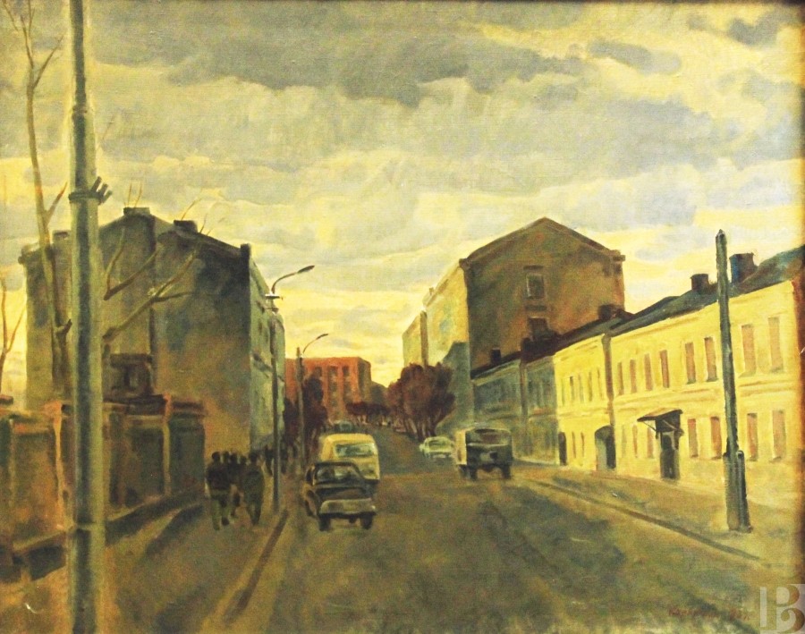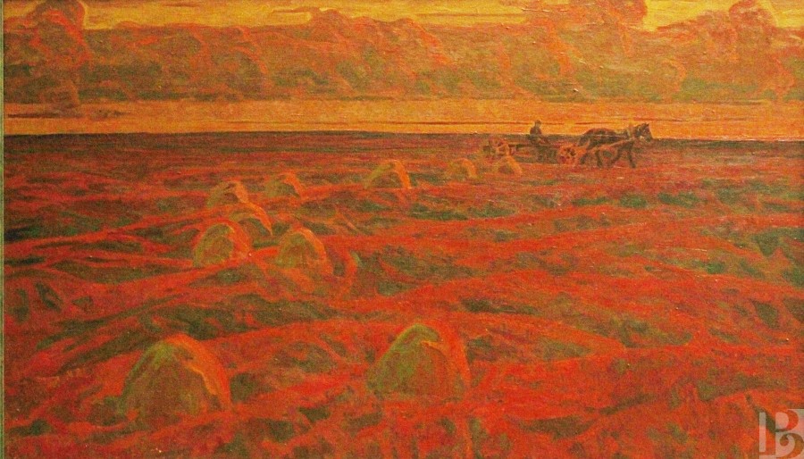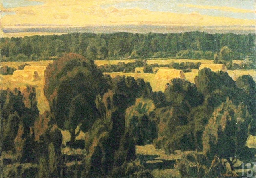 Василий Петрович Корнюшин родился в 1928 году в селе Заокском под Рязанью. В 1945 – 1950 гг. учился в Рязанском художественном училище у В.Е. Куракина. С 1967 года живописец вступил в Союз художников СССР и начал активно участвовать в выставках самого разного масштаба. Вообще, «масштаб» – это про его полотна, впечатляющие своей мощью. Даже ранние жанровые зарисовки и натюрморты, такие как «Кухня», таят в себе молчаливую силу и серьезность. Что уж говорить об образах природы, к которым Василий Петрович обратился в 1970-е годы. Поля и стога, реки и облака, закат, накрывающий перед сном деревни, – все это так просто и знакомо… Но художник смотрит не перед собой, а снизу вверх, превращая каждый камешек в свидетеля исчезнувших эпох, а каждую тучу – в грозную вестницу дождя. И, конечно, особые отношения у мастера с оттенками красного. Этот цвет пульсирует на многих картинах, отбивая вечный ритм жизни, и оттого сюжеты кажутся не гнетущими и мрачными, а полными энергии созидания. Впрочем, в этом колористическом подходе – и своеобразное общение художника со зрителем. Расстроенный или взвинченный человек сочтет «красные» сюжеты тяжелыми для восприятия, а смиренный найдет в них особую прелесть…