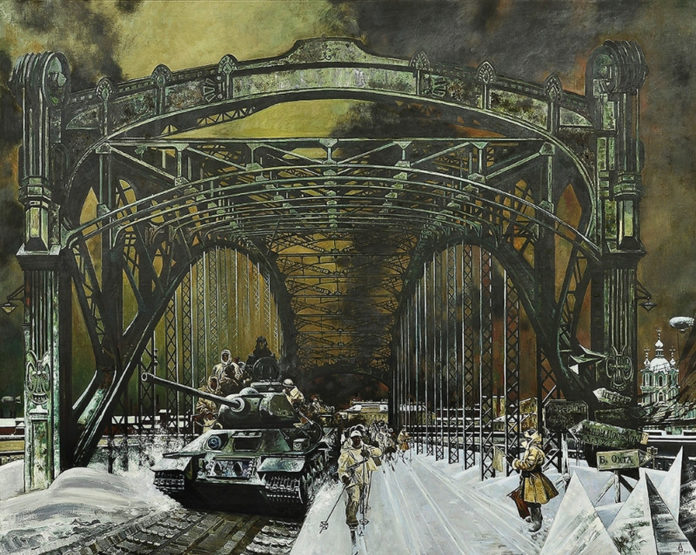 Она включает более тридцати произведений, выполненных в разные годы. Среди них – картины на волнующие темы прошлого страны. В преддверии юбилея Победы автор представил на выставке одну из своих программных работ – «Ленинград. Январь 1943 года. Блокада» (2005).
