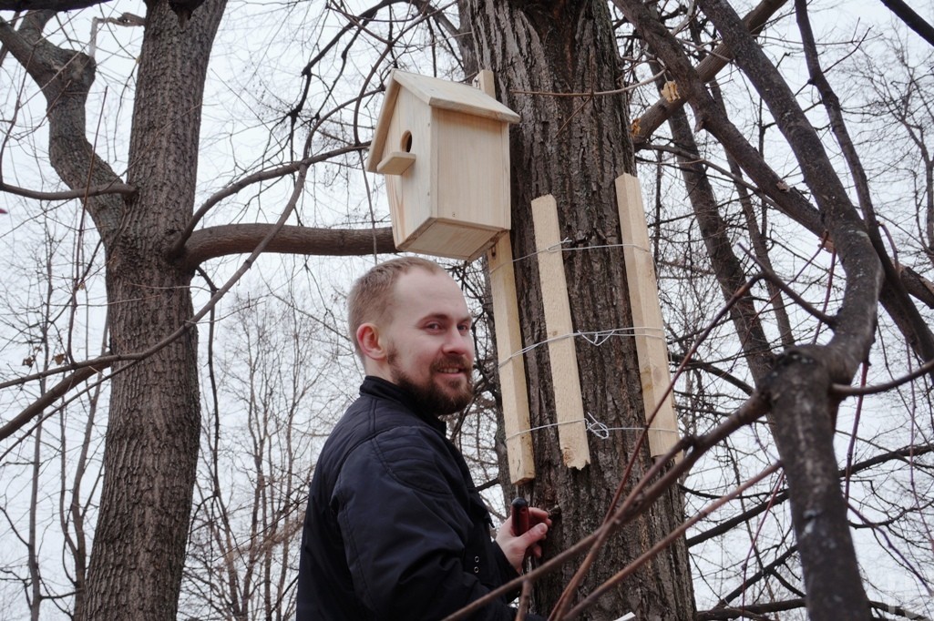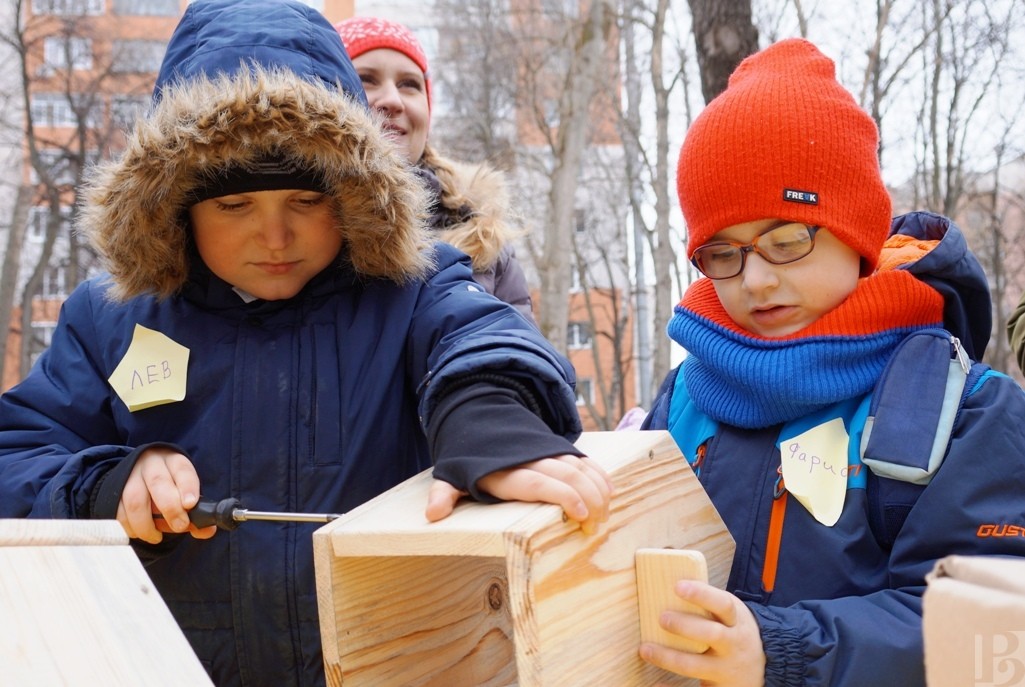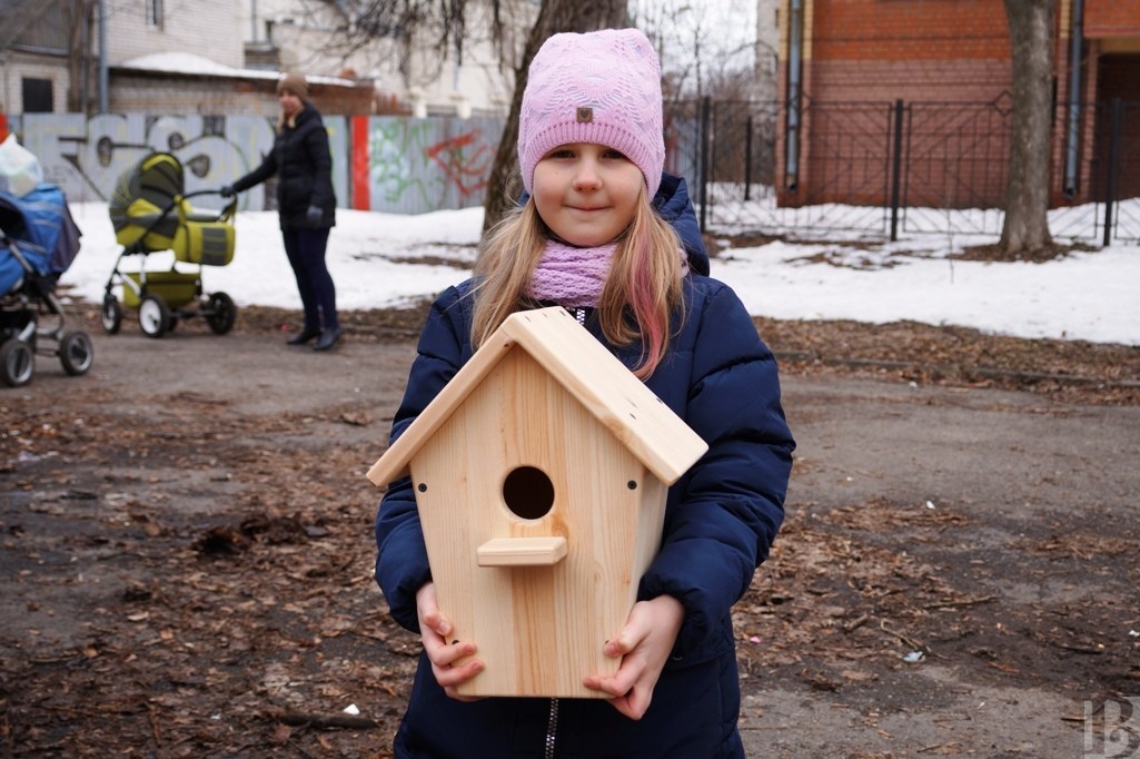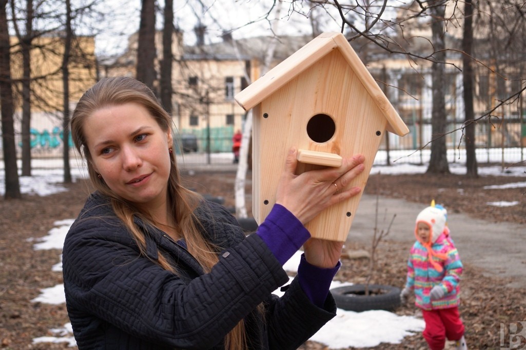 На праздник Ирина и Дмитрий Радостины, проживающие в доме №12 по улице Павлова, пригласили жителей окрестных домов, у которых есть маленькие дети. Пока Дмитрий готовил столярные инструменты для работы, Ирина рассказала молодым мамам и пришедшим на праздник мальчишкам и девчонкам о том, какие птицы обитают в городе. Большинство из них въет себе гнезда, а вот для скворцов надо смастерить домики.