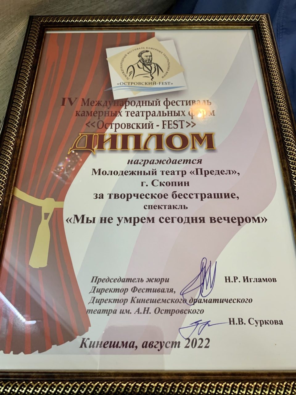 Скопинский молодежный театр «Предел» представил моноспектакль «Мы не умрем сегодня вечером» по мотивам пьесы «Антигона» Жана Ануя, в исполнении Елены Талалаевой, режиссер Владимир Дель. Этот спектакль за прошедший сезон уже становился лауреатом таких фестивалей, как XIII международный фестиваль моноспектаклей SOLO в Москве и IV Всероссийский фестиваль моноспектаклей «ЧАТ» в Омске. На фестивале «Островский-FEST» в Кинешме спектакль получил Специальный приз и Диплом «За творческое бесстрашие».