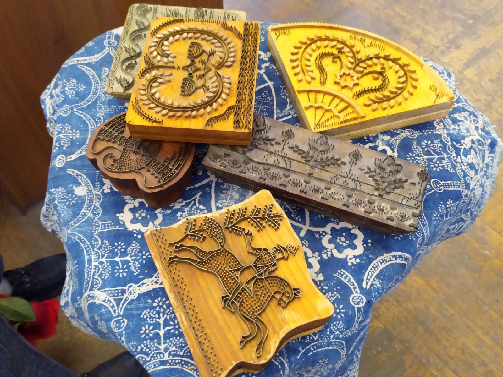 Мастерица привезла с собой множество образцов старинных и современных печатных тканей, которые могли посмотреть все желающие. Это, например, «манерники» – отрезы с примерами рисунков и номерами. Красильщики выдавали заказчикам по половинке «жеребий» – палочек с номерами выбранных узоров, а вторые половинки оставляли себе для выполнения заказа.
