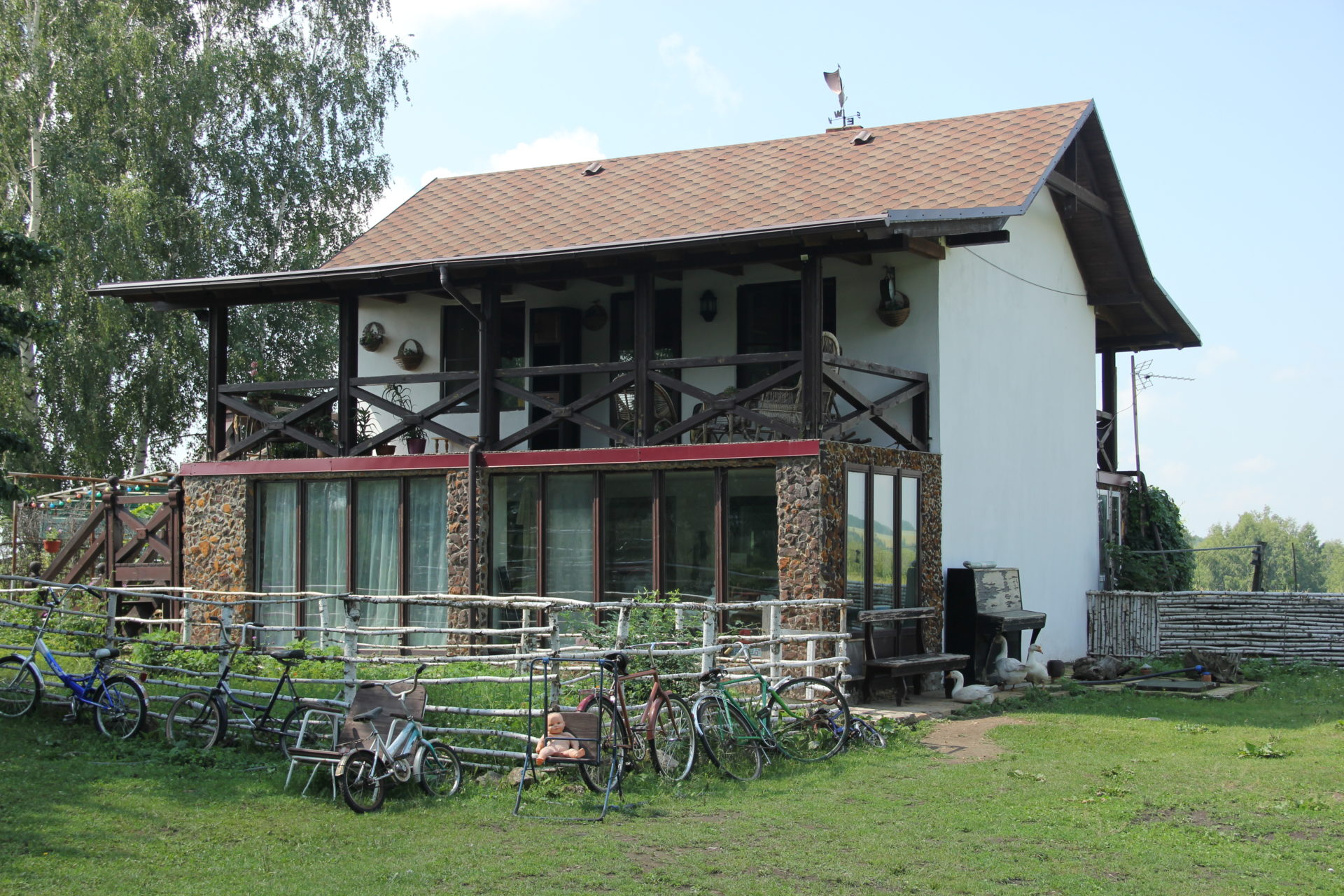 Но созерцание пейзажей – это на десерт. В просторном дворе гостей ждет масса интересных занятий. Малыши обрадуются игрушкам и машинкам, ребята постарше могут сыграть в футбол и баскетбол на площадке. А взрослые в это время имеют возможность пожарить шашлыки, раздуть самовар или просто поблаженствовать в тени на садовых качелях. У огородного плетня гнездятся сразу шесть-семь подростковых велосипедов: их Ирине Константиновне отдают все, у кого есть возможность, чтобы детям было на чем покататься. Венец летнего отдыха – деревянный стол длиной в несколько метров под густой листвой грушевых деревьев. «Зачем такой большой?» – интересуюсь я. «Иногда еще и маловат», – смеется хозяйка.