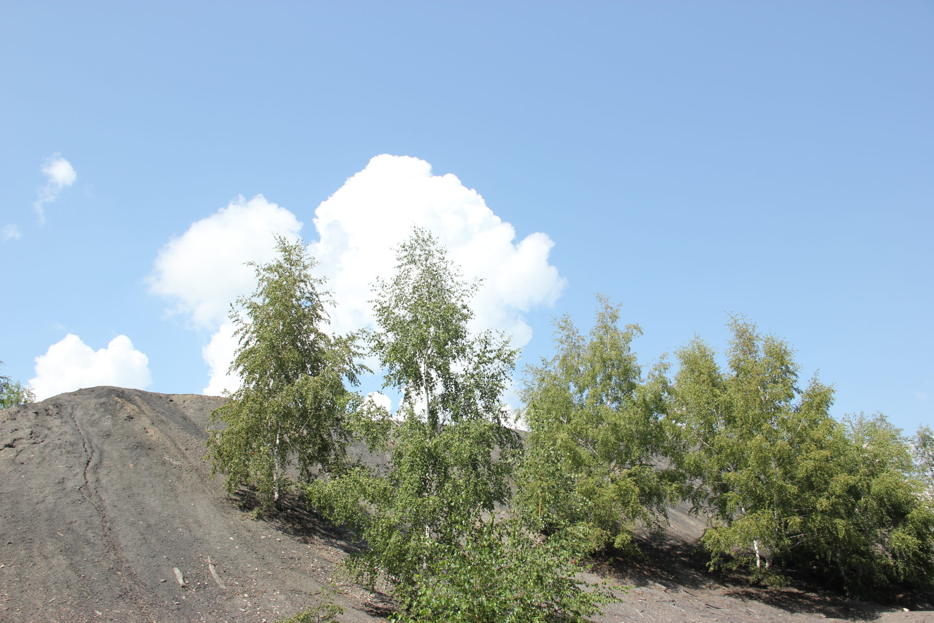 А после экскурсии приятно прогуляться по террикону, который начинается сразу за оградой. Это искусственные насыпи из отработанных горных пород. Голые серые холмы с березками на фоне синего неба выглядят как горный пейзаж… Красота, и только!