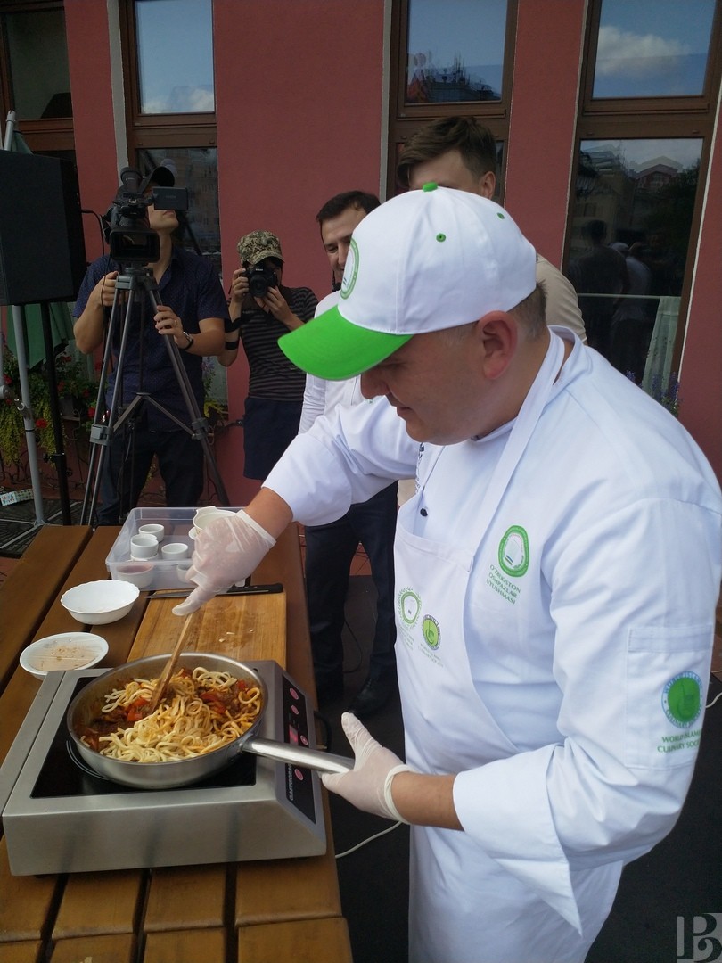 Мастер-класс по приготовлению одного из популярных блюд узбекской национальной кухни провел шеф-повара Дилмурод Исмаилов. Он работает уже около 20 лет в ресторане Гостевого дома при Посольстве Республики Узбекистан в РФ. Блюдо готовится из мяса. Причем, подойдёт любое мясо, даже фарш. Оно пережаривается, а потом добавляются лук, чеснок, перец болгарский, сельдерей. Блюдо можно подавать как на первое, так и на второе. Готовится оно около часа.