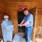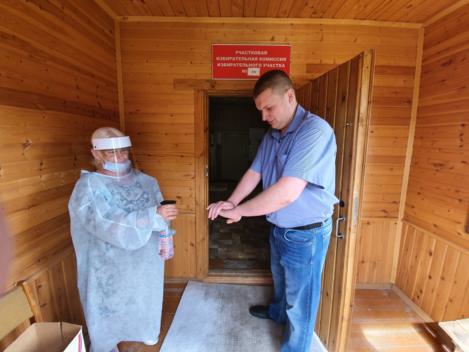 На входе им антисептиком обрабатывают руки, выдают маску, перчатки, салфетки, ручку. Вход и выход граждан организован с соблюдением интервала, чтобы не было скученности. Члены избирательной комиссии работают в специальной экипировке.