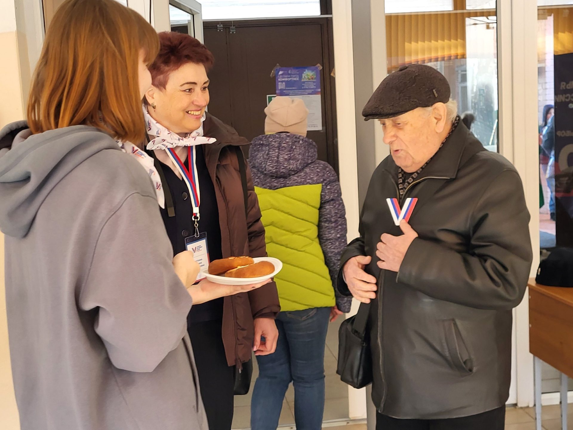 На избирательном участке Леонида Ивановича Окрута встретили блинами и горячим чаем, все вместе повеселились на Масленице и ушли домой с хорошим настроением.