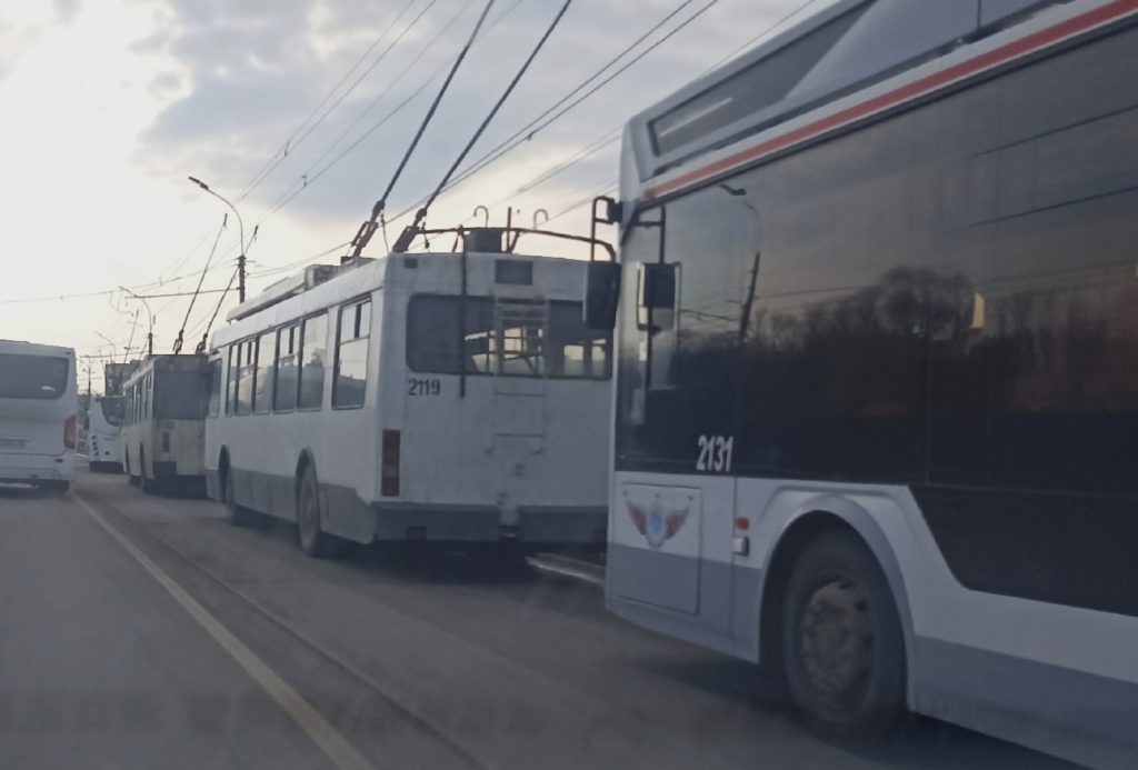 На Московском шоссе в Рязани троллейбусы встали в обе стороны. Произошел обрыв контактной сети и ремонтные бригады уже приступили к работе. Пробки на дороге нет, несмотря на то, что троллейбусы скопились на полосе для движения общественного транспорта.