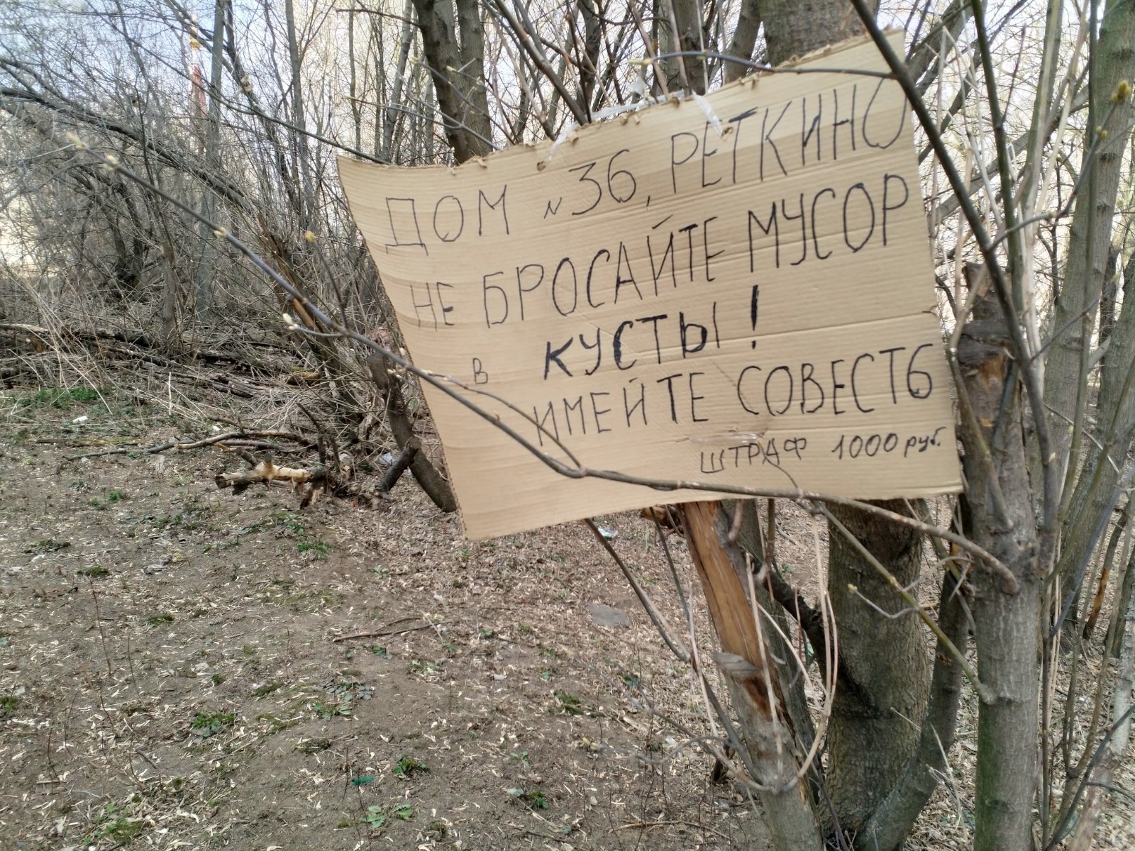 Жители поселка Строитель написали предупреждение для граждан, проживающих в соседнем селе Реткино, чтобы те не бросали мусор возле их домов и даже пригрозили штрафом в 1 тысячу рублей. Заросшую американским кленом территорию возле дома люди убрали, мусор запаковали в мешки, которые почему-то на свалку не вывезли, а оставили прямо на месте уборки.
