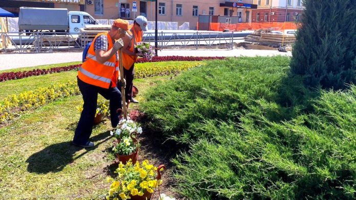 Клумбу на площади Победы сегодня дополнили ампельной петунией. Работники Дирекции благоустройства высадили 43 кашпо из белых, желтых, фиолетовых и желто-белых цветов в грунт.