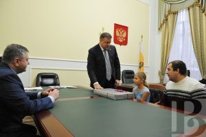 Девятилетняя рязанка Анастасия Крылова пришла в приемную вместе с папой Алексеем. Девочка написала письмо Президенту России с просьбой подарить ей ноутбук. От имени главы государства подарок вручил Насте Николай Любимов. «Мы знаем, что ты учишься хорошо, активно участвуешь в общественной жизни класса и школы, в разных конкурсах. Надеемся, что ноутбук поможет тебе в учебе», – сказал губернатор, пожелав юной рязанке дальнейших успехов.