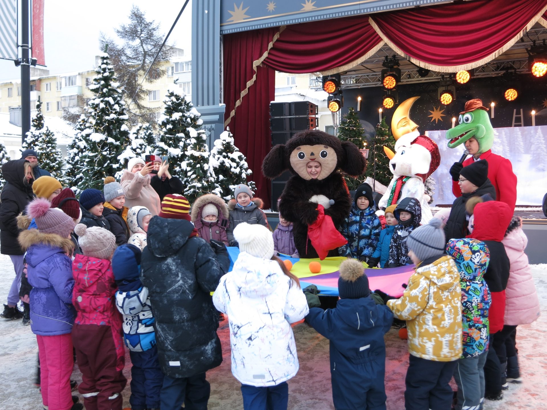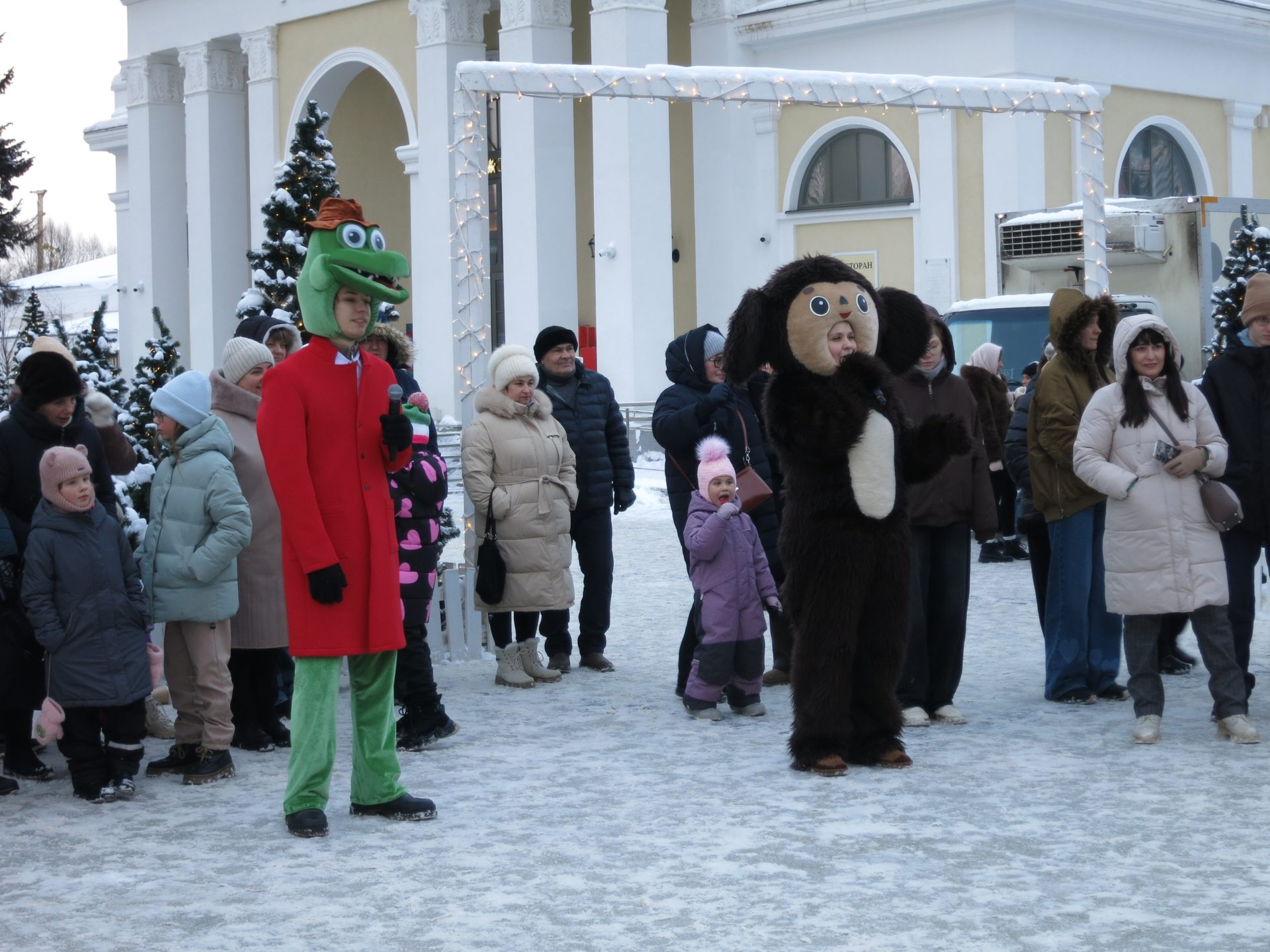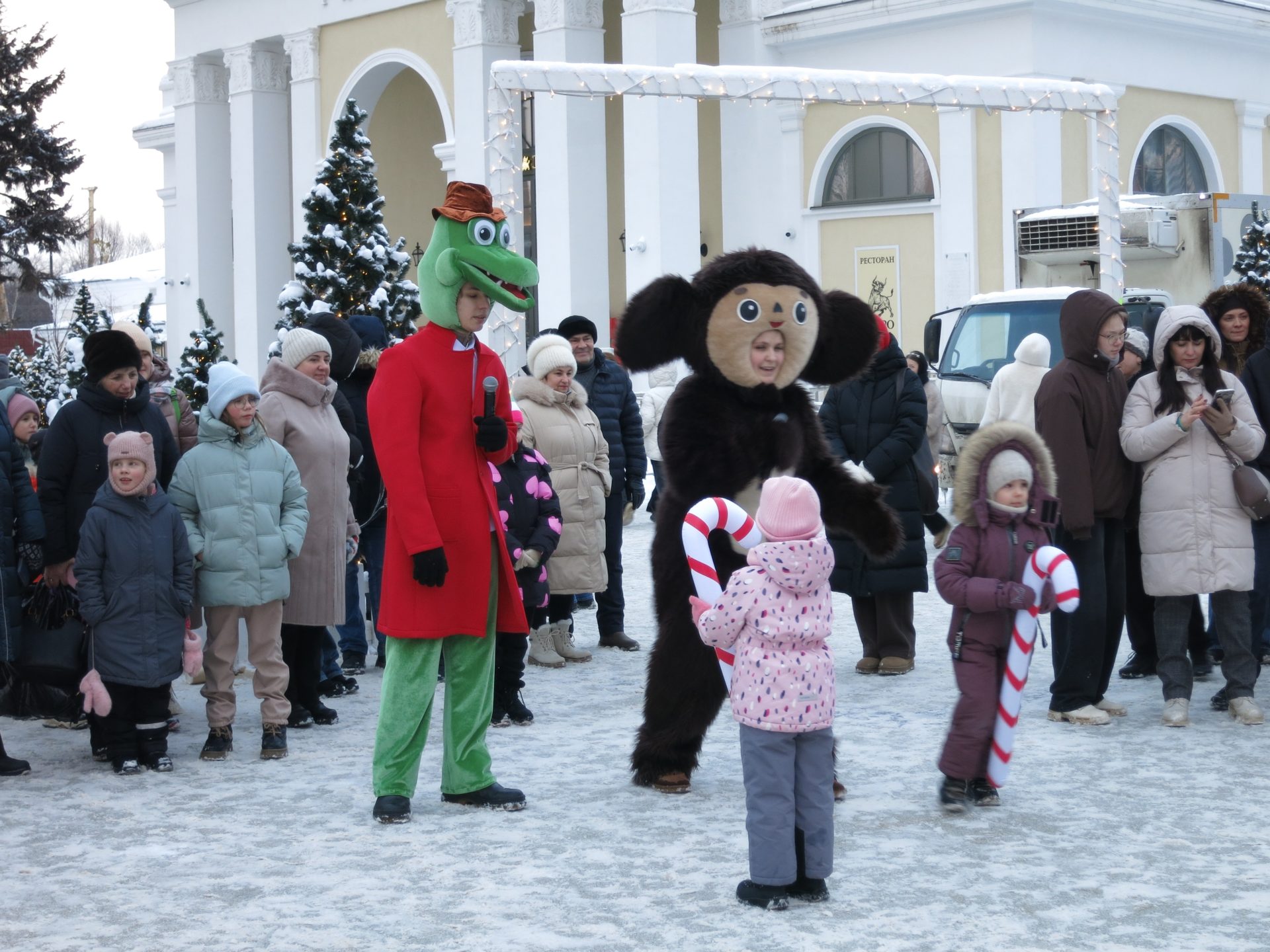 В этот день маленьких рязанцев и гостей города развлекали аниматоры, которые надели костюмы Чебурашки, Крокодила Гены и Снеговика. Ребята участвовали в зимних играх: они прыгали на перегонки, стараясь не подвести свою команду, находили необычные подходы к заданиям, а также с удовольствием контактировали с ведущими. Каждый участник получил сладкий приз.