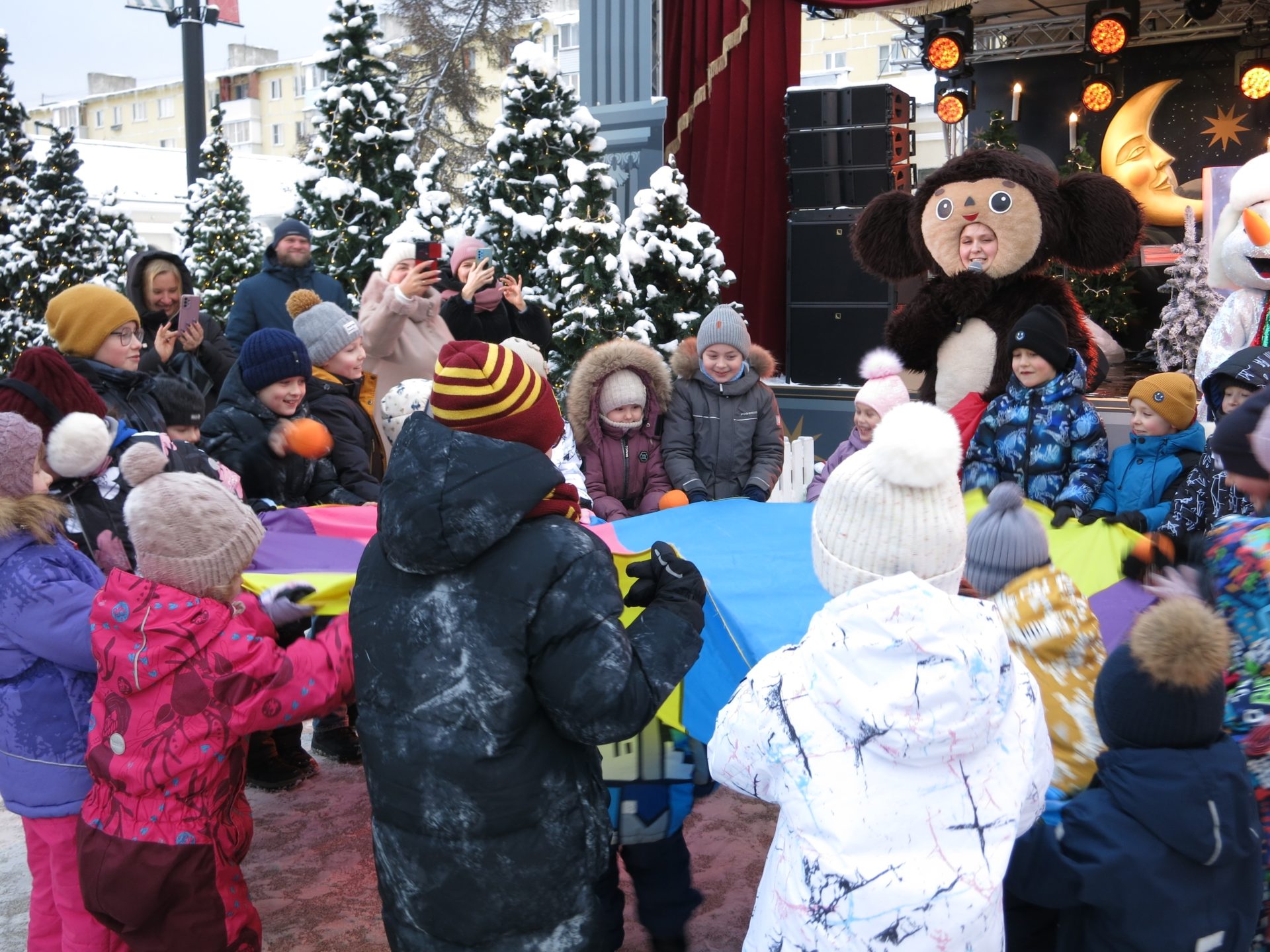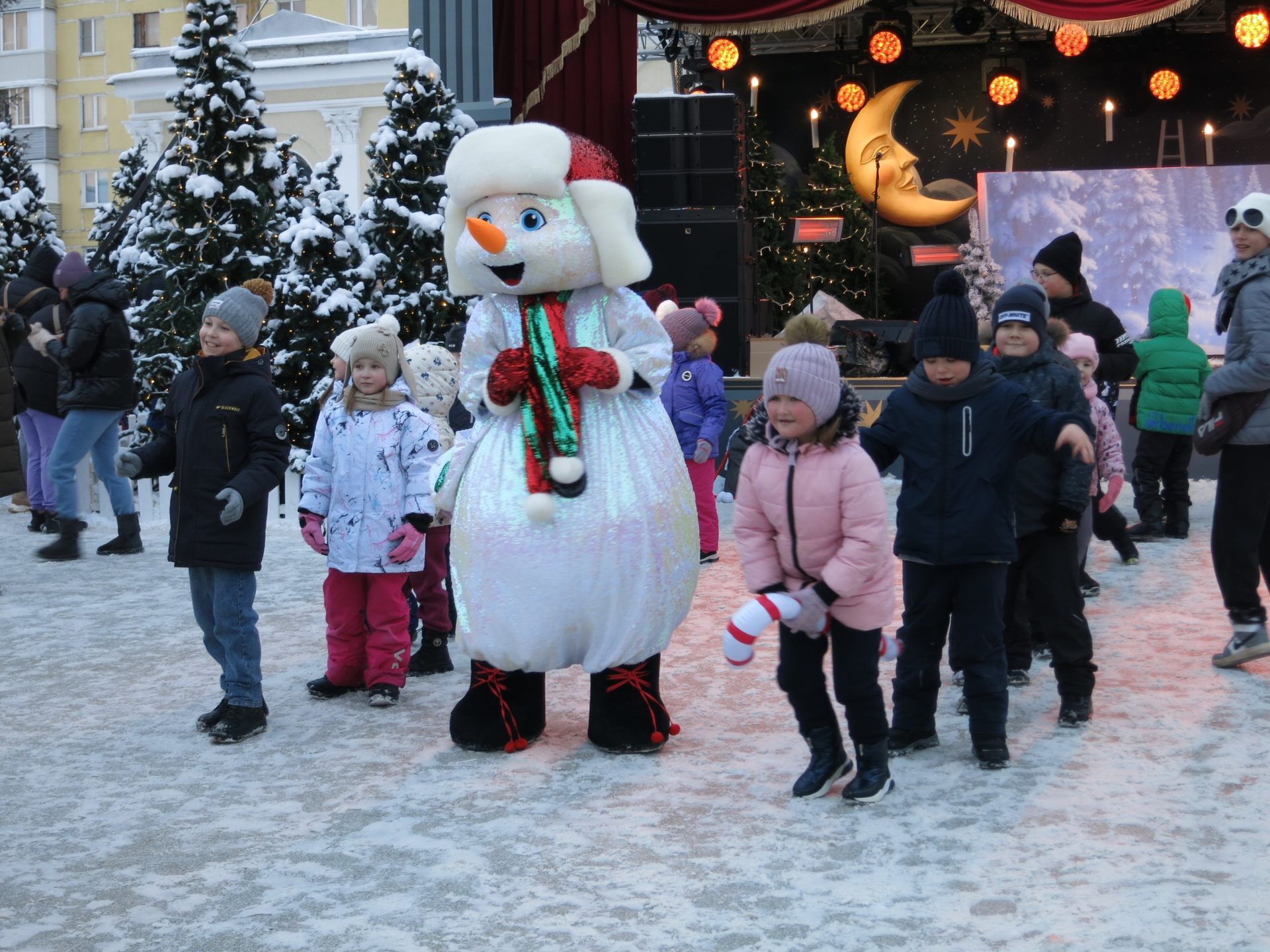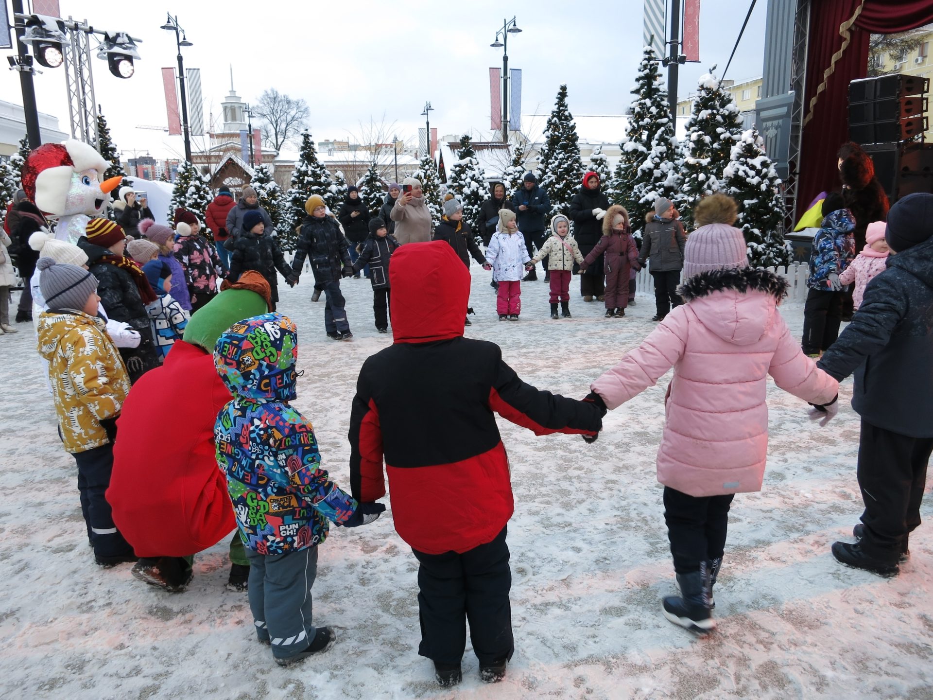 В этот день маленьких рязанцев и гостей города развлекали аниматоры, которые надели костюмы Чебурашки, Крокодила Гены и Снеговика. Ребята участвовали в зимних играх: они прыгали на перегонки, стараясь не подвести свою команду, находили необычные подходы к заданиям, а также с удовольствием контактировали с ведущими. Каждый участник получил сладкий приз.