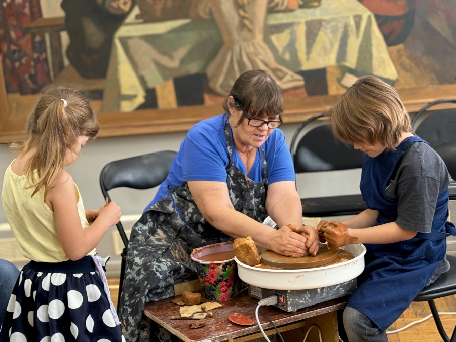 Затем поднимаемся на второй этаж и попадаем на мастер-класс «Гончарный круг». Здесь гостей основам керамики обучает член Союза художников России, художник-керамист Галина Сметанина. По словам Ирины Павловой, в прошлом на гончарном круге выкручивались бытовые крынки и кувшины – атрибуты сельской жизни, а творчество Виктора Иванова напрямую связано с крестьянской землей. Вот почему это очередная отсылка к пониманию как самого художника, так и его работ, а главное – опыта наших предков.