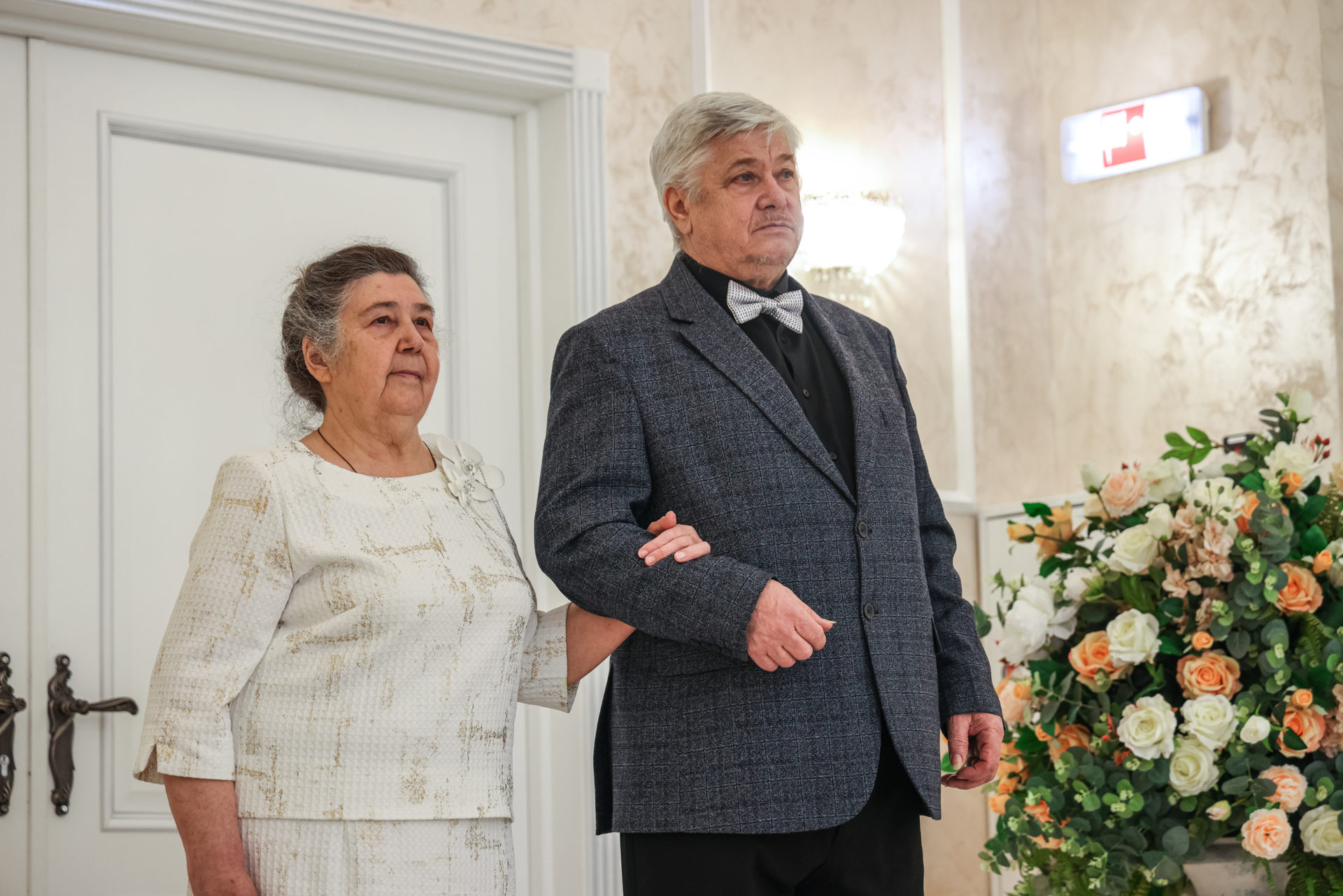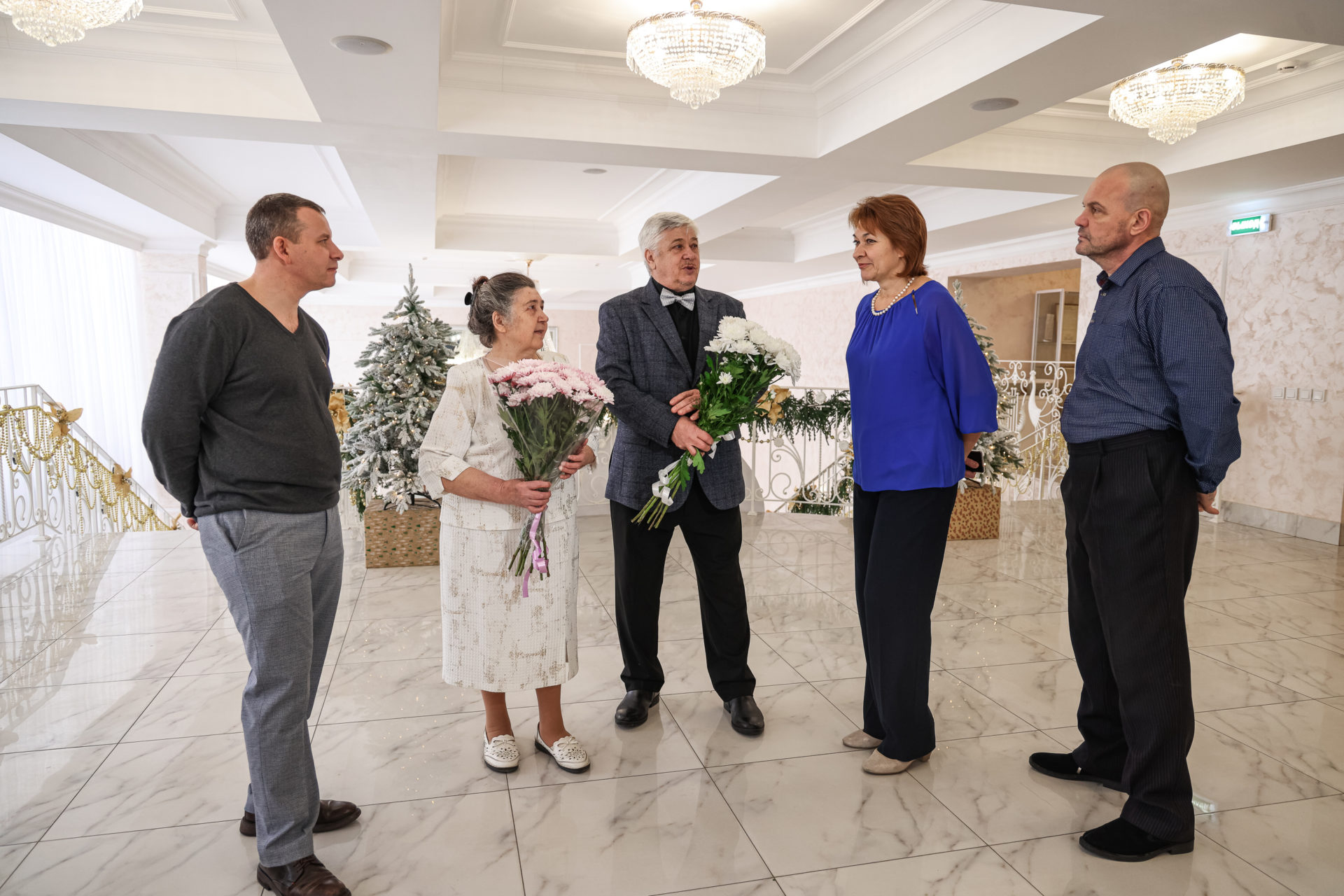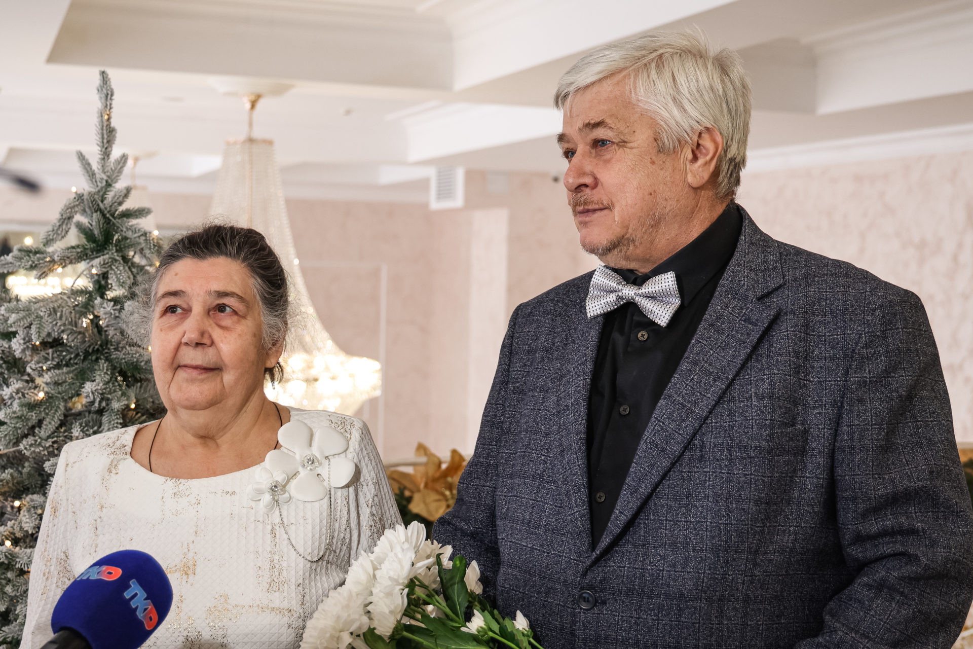 Церемонии проходили в течение дня. Кроме этого, прошло чествование пар с солидным семейным стажем. Так супруги Юдаевы поженились тоже в преддверии Нового года, но только полвека назад, а сегодня у них «золотая» свадьба. Наталья и Анатолий были знакомы со школы, расписались после службы молодого человека в армии. Они говорят, что секрет их счастливой жизни — в терпении и прощении.