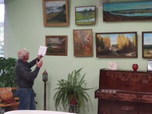 Михаил Чернов представил каждую картину ,рассказал об ее авторе. На открытии присутствовали читатели с ограниченными возможностями здоровья и члены литературно-музыкального салона “В гостях у музы”.