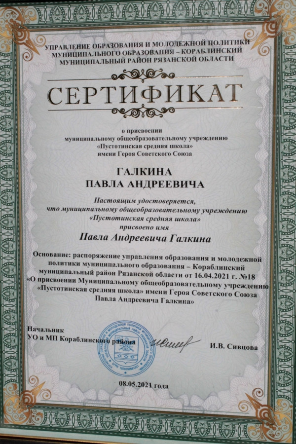 Сертификат о присвоении школе имени героя вручила директору этого образовательного учреждения Ольге Ненастиной начальник управления образования и молодежной политики Кораблинского района Ирина Сивцова. Имя Героя Советского Союза школе присвоено с письменного согласия (таковы требования современного законодательства) Павла Андреевича Галкина. Он живет в настоящее время в городе Ейске Краснодарского края и 9 мая отметил вместе со всей страной День Победы.