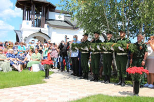 Павел Лыткин, Михаил Кривцов, Надежда Анисимова и Андрей Шустов перерезают красную ленточку. К памятнику ложится гирлянда воинской славы и живые цветы.