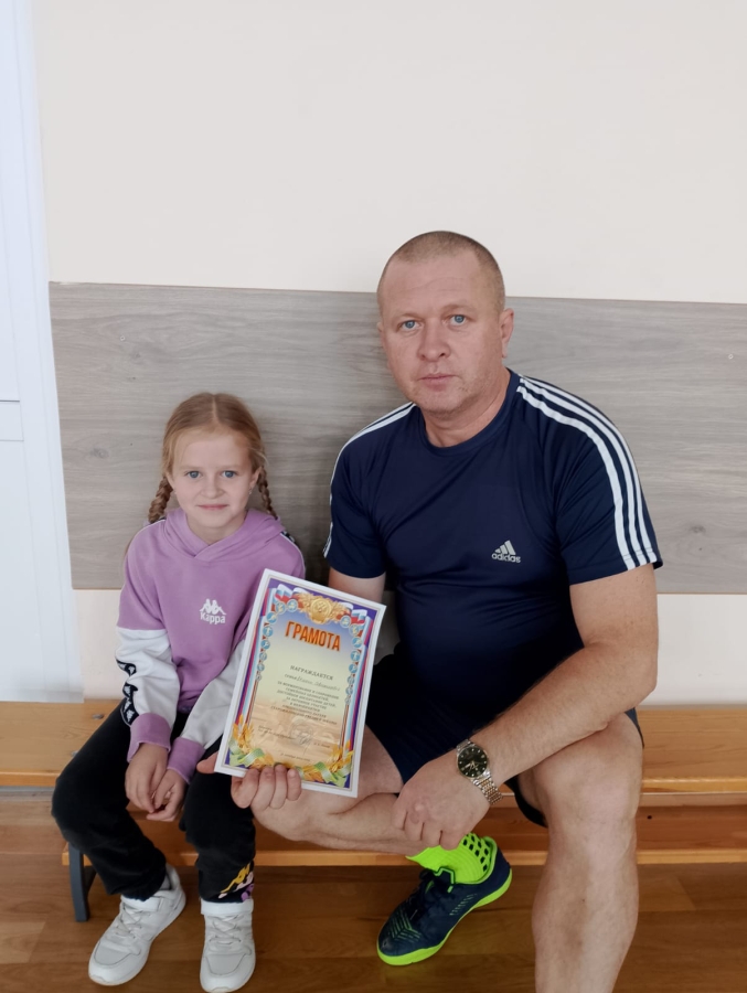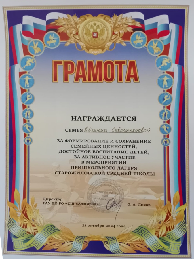 Почётную грамоту отцу девятилетней Жени Севостьяновой вручил директор спортивной школы «Адмирал» Олег Лисов. Олег Александрович благодарен Алексею, который демонстрирует жителям Старожилова пример здорового образа жизни, увлечения физкультурой и спортом. Но прежде всего папа показывает достойный пример правильного отношения к семье.