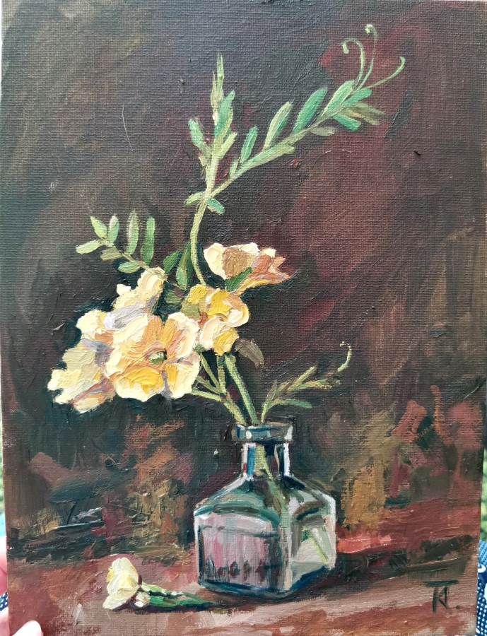 Для Татьяны творчество – прежде всего способ получать удовольствие, и она старается посвящать своему хобби каждую свободную минуту. В ее семье даже хранится фото, где маленькая Таня сидит за столом, заваленным красками, карандашами, тряпочками и другими принадлежностями. «А вот рисованием я увлеклась после того, как нашла у дедушки Сергея Григорьевича коробку с масляными красками, – вспоминает моя собеседница. – Так понравился их запах, тягучесть, цвет, что и сомнений не осталось: хочу рисовать. Помню, что дедушка не сразу разрешил мне ими пользоваться, поэтому коробка была для меня неким сокровищем».