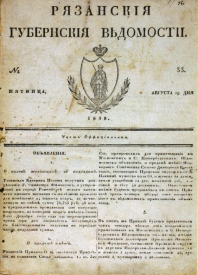Называлась она «Рязанские губернские ведомости», и появлением ее мы обязаны суровому императору Николаю I. О нем много чего нелицеприятного сказано и написано, но все-таки именно он приказал в 1837 году начать выпускать в российских губерниях газеты, которые будут называться «Ведомости», от слова – ведать, то есть знать, понимать, о чем пишешь, и отвечать за качество информации.