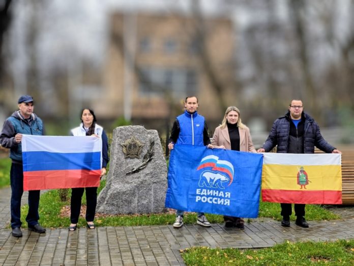 Перед посадкой в автомобиль волонтёры по традиции делают снимок на память с флагами России, партии «Единая Россия» и Рязанской области у мемориального знака «Орден Победы».