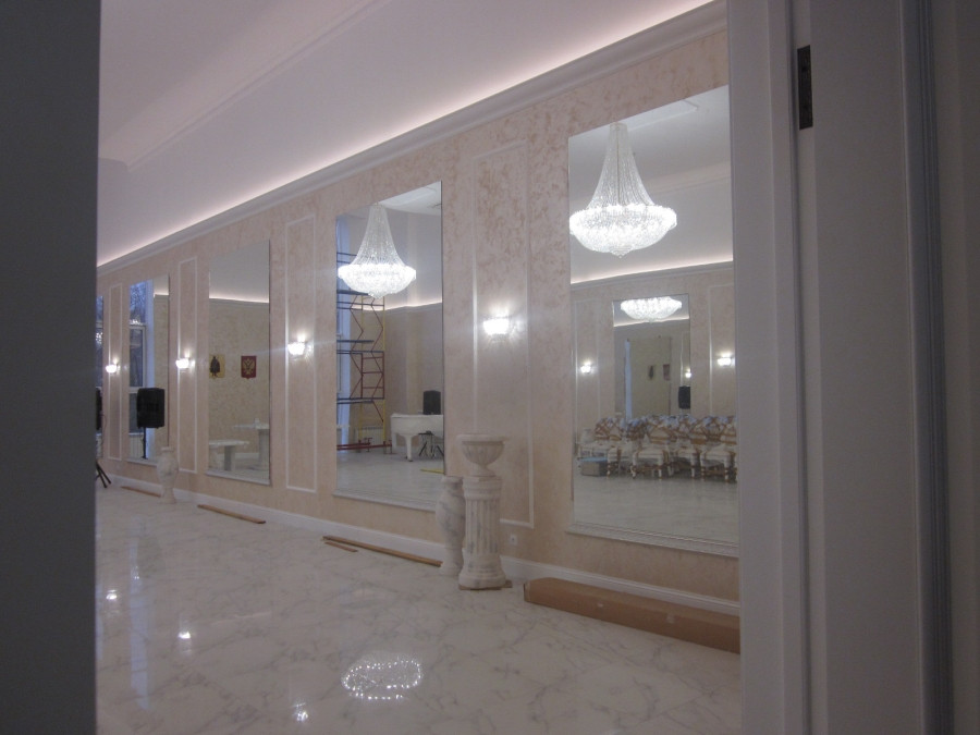 У Дворца торжеств будет три входа: парадный для молодоженов и еще два, ведущие в помещения для приема. Внутри несколько фотозон, в том числе зимний сад и балкон, на лестницах, ведущих на второй этаж, установлены кованые перила. На втором этаже практически готовы комнаты жениха и невесты.