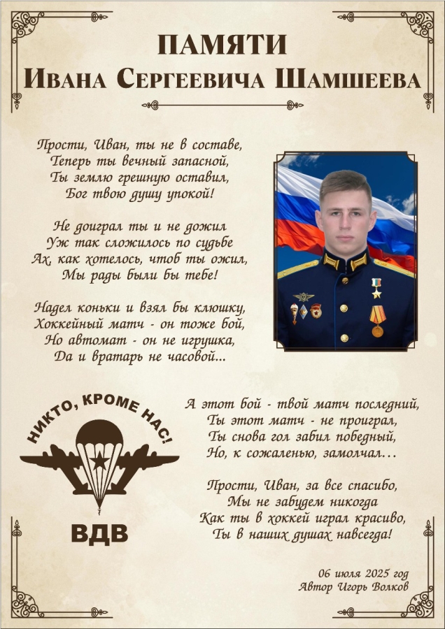 Организаторы турнира рассказали пришедшим поболеть за хоккеистов рязанцам, что Иван Шамшеев родился 5 августа 1999 года в Калининграде. В 2007 году пошел в 1 класс средней школы города Москвы. С 2003 года занимался хоккеем в СДЮСШОР «Спартак». Первый тренер Ивана Шамшеева – заслуженный тренер России Владимир Николаевич Кузнецов. В 2017 году Иван окончил школу №1282 с углубленным изучением английского языка и поступил в Рязанское гвардейское высшее воздушно-десантное ордена Суворова дважды Краснознаменное командное училище имени генерала армии В.Ф. Маргелова.