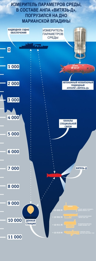Первое погружение ждали долго, но мало кто думал, что на дно Марианской впадины русский «Витязь» пойдет в самый канун Дня Победы. Снабженный рязанским прибором российский автономный необитаемый подводный аппарат совершил погружение на 10028 метров.