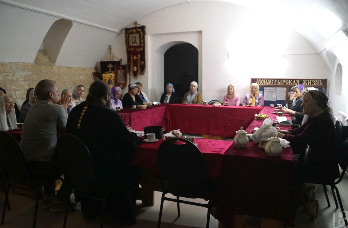 Беседы в обители проходят уже третий год. На еженедельных встречах участники под руководством батюшки разбирают воскресное евангелие и обсуждают другие темы, связанные с толкованием Священного Писания и жизнью Церкви. По словам руководителя занятий, насельника обители иеромонаха Александра (Пименова), такой формат можно назвать наиболее подходящим для взрослых прихожан. Общение за чашкой чая не столь формально, как лекция, каждый приходящий на беседу может задать интересующий его вопрос и получает возможность лучше разобраться в православном вероучении.