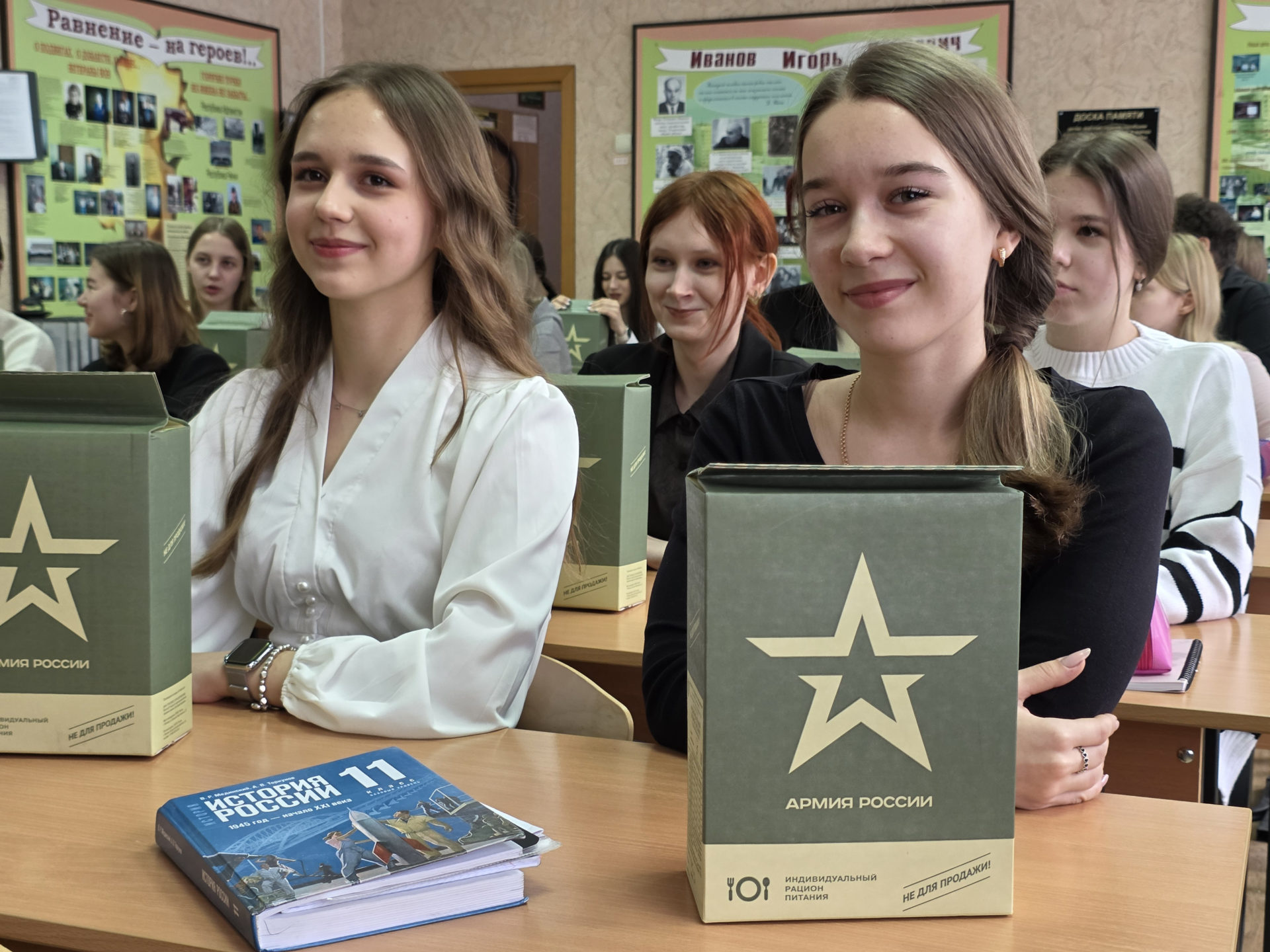 На урок к ребятам пришли курсанты второго курса РГВВДКУ имени генерала армии В.Ф. Маргелова. Они показали, как быстро и правильно разбирать и собирать автомат Калашникова, у самых активных школьников приняли зачёт и поблагодарили старшеклассников за хорошую военную подготовку. На память сделали коллективное фото и каждому подарили индивидуальный рацион питания (сухпаек).