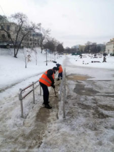 С утра бригады рабочих вышли на обработку пескосоляной смесью и очистку тротуаров и пешеходных дорожек в парках, скверах, зеленых зонах.