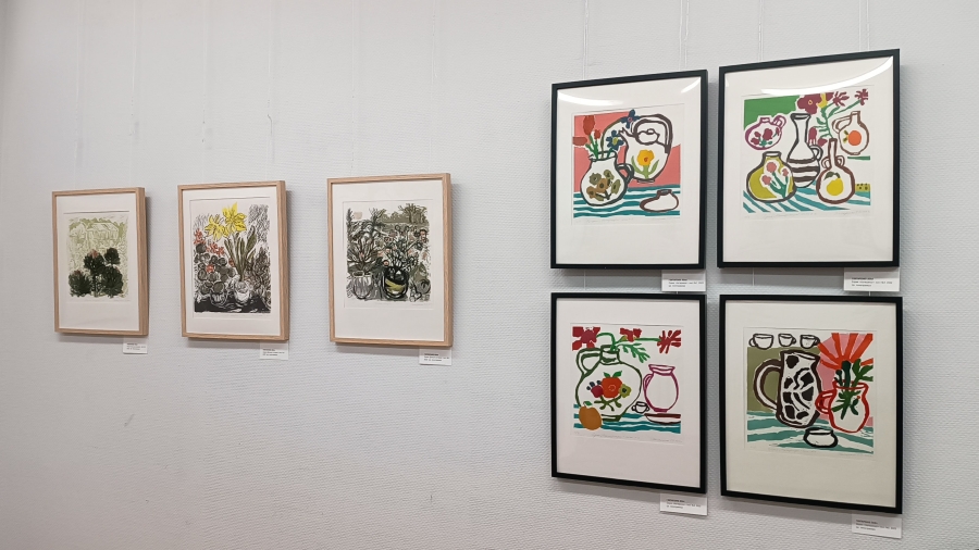 Обращение художницы к печатной графике, с одной стороны, логично: она окончила Московский полиграфический институт. С другой стороны – много лет Елена Гонтаренко была известна своими гобеленами, затем – живописными натюрмортами, а кто-то знает её как автора прекрасных мягких игрушек. И вот – первая персональная выставка графики, цветной и чёрно-белой (монохромной). Самые ранние произведения в экспозиции датированы 2017 годом. Почти десять лет поисков, разноплановых серий, техник. Большинство работ – линогравюры (гравюра резцом по линолеуму), но есть и монотипии, диатипии (когда изображение – оттиск с гладкой поверхности), коллажи…
