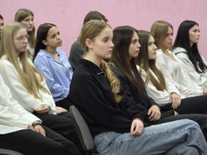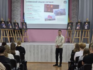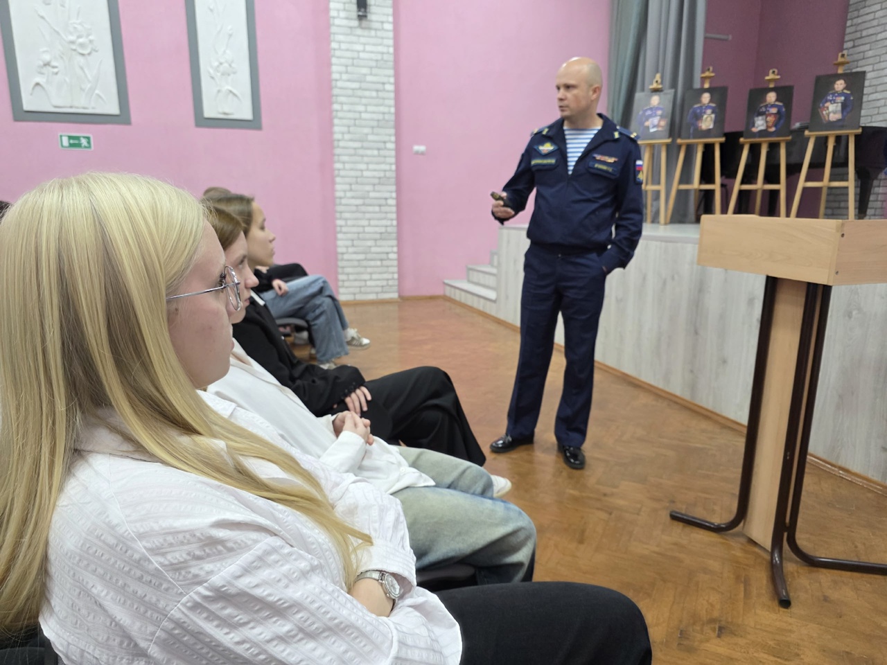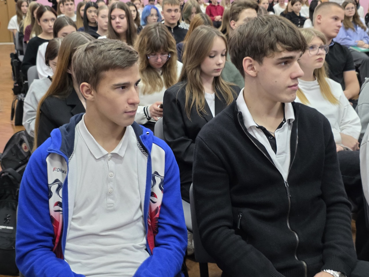 Далее Роман Евгеньевич представил учащимся педагогического колледжа участника специальной военной операции, кавалера ордена Мужества Вячеслава Вышинского, который продолжил рассказ уже непосредственно о героизме российских солдат в СВО, и тех действиях украинского режима, которые Роман Иголкин назвал геноцидом.