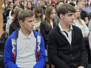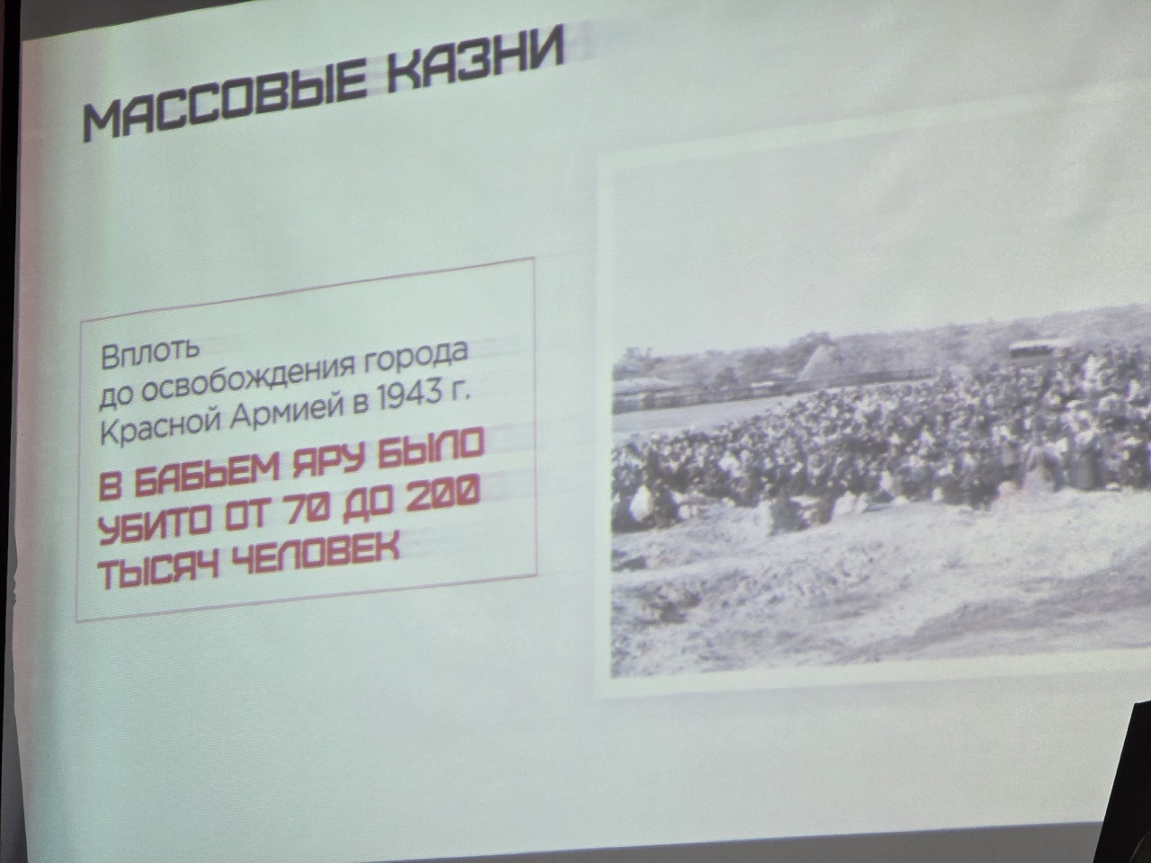 Роман Евгеньевич рассказал молодёжи о холокосте. Холокостом называют уничтожение нацистами и их приспешниками шести миллионов евреев, а также миллионов людей других национальностей во время Второй мировой войны. Массовые убийства начались в июне 1941 года с расстрелов мирных жителей еврейской национальности во время германского вторжения в Советский Союз. В конце 1941 года немцы стали депортировать евреев в лагеря смерти, расположенные на территории оккупированной Польши. К маю 1945 года из каждых трех евреев в Европе двое были убиты.