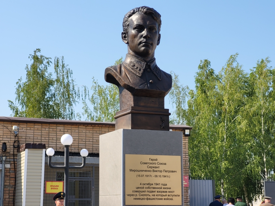 Свой подвиг он совершил 9 октября 1941 года. Подрывной команде во главе с сержантом Мирошниченко было поручено подготовить к взрыву железнодорожный мост через реку Снопоть на участке Фаянсовая – Рославль. Установили заряд и стали ожидать приказ, но его не последовало. В это время к мосту приблизились на нескольких грузовиках фашисты. И тогда ответственность за взрыв моста взял на себя политрук роты Чижиков, а выполнить задание вызвался Мирошниченко. Однако в последний момент осколком перебило шнур, и раненый Виктор Петрович ценой своей жизни привел заряд в действие. В листовке, выпущенной в эти страшные дни, о подвиге Мирошниченко рассказывается так: «Несмотря на оглушительные завывания вражеских мин и цоканье пуль, Мирошниченко настойчиво пробирался к заряду. Он получил ранение, но продолжал ползти к цели. Вот и заряд. Но чтобы успеть, нужно пожертвовать своей жизнью. Отважный сержант поджег заряд, когда фашистские автоматчики были уже на мосту». Единственный мост, по которому тяжелая боевая техника могла переправиться на левый берег реки, был уничтожен. Без сомнения, это задержало продвижение фашистов и спасло сотни, а может быть, и тысячи жизней советских солдат.