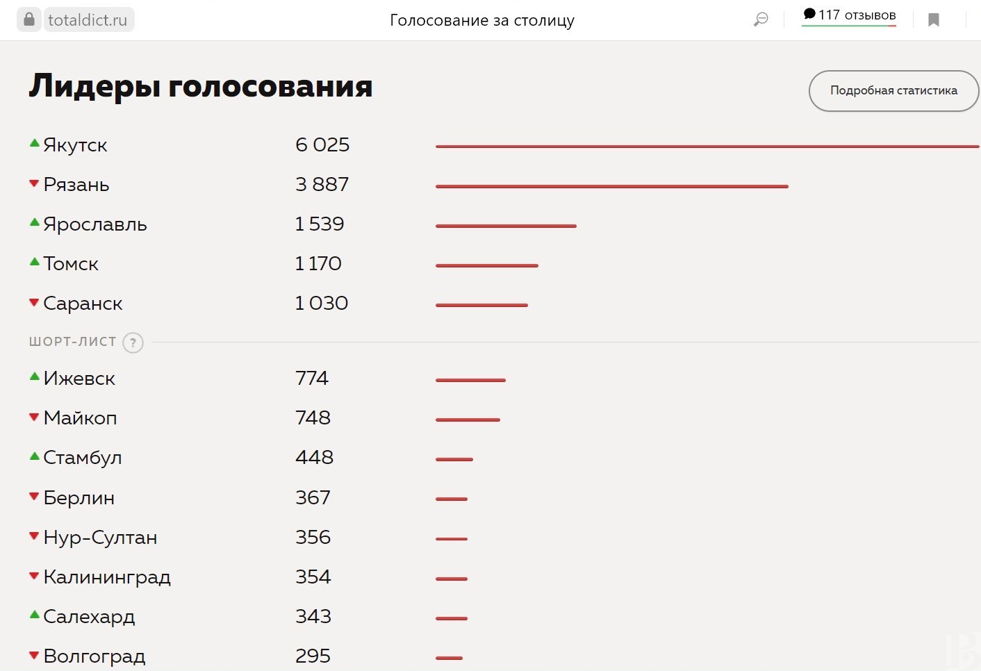 На данный момент в гонку за звание столицы Тотального диктанта в 2021 году включились 13 городов. Первыми идут Якутск (6 025 голосов), Рязань (3 887), Ярославль (1 539), Томск (1 170) и Саранск (1 030). Отдать свой голос за любимый город могут все желающие на сайте totaldict.ru до 24 ноября.