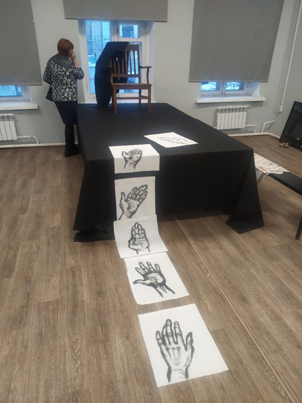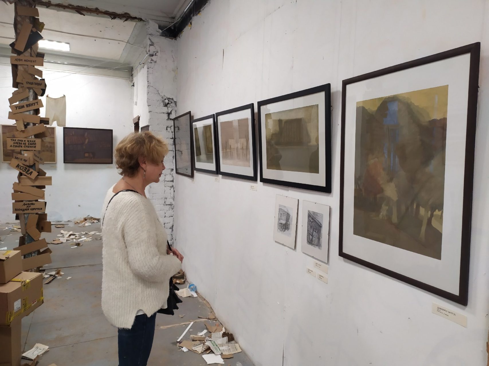 В музейно-выставочном центре «Фотодом» имени Е.Н. Каширина начала работу выставка Надежды Блиновой «Мадам, уже падают листья… ». Графика Надежды Михайловны всегда глубока, метафорична и полна скрытых смыслов. В этот раз в названии и оформлении выставки художница иронично обыграла и возраст, и тему скоротечности времени в целом. Об этом зрителю говорят и рассыпанные всюду осенние листья, которые превращаются в пыль под ногами, и разбросанные старые вещи, и обрывки газет. С самого начала выставка затягивает в себя знакомыми цитатами, лозунгами, пословицами, которые тоже были и остаются приметами своего времени.