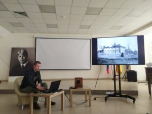 Показывали фотографии, комментировали и рассказывали занимательные истории краеведы, гиды Никита Гирин и Андрей Меркунов. Снимки, сделанные на старинную фототехнику, сохранились в высочайшем качестве, и и современные исследователи могут изучать детали архитектуры, техники, костюмов, утвари разных эпох. Так, на коллективном снимке с сельской свадьбы можно разглядеть не только парадные костюмы и мундиры, но и лавку местного купца Алфутова с рекламой развесного чая. Такие же подробности видны на снимках храмов, полевых работ, торжеств, похорон, а особенно – на семейных постановочных фото в студии Ивана Филатова.