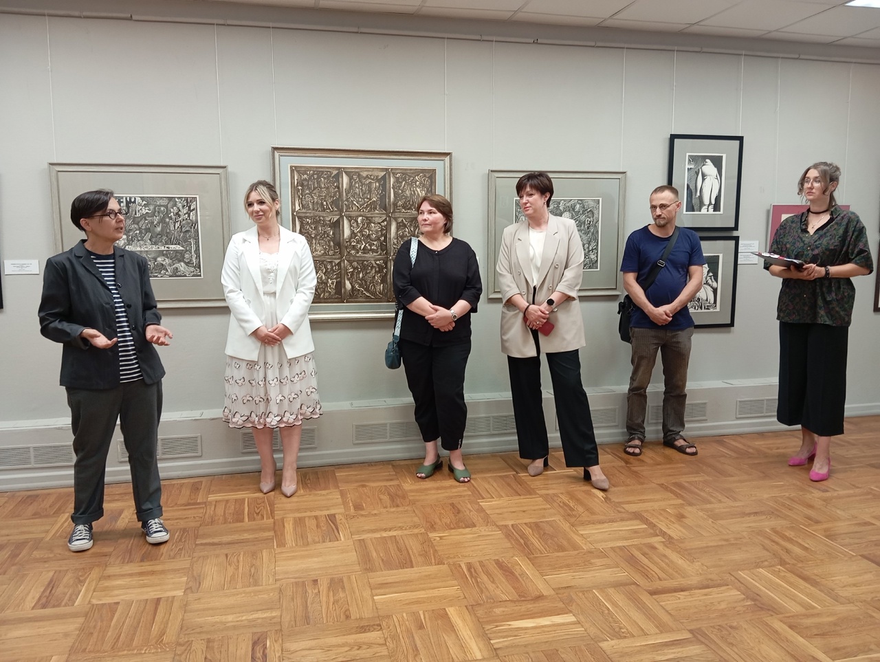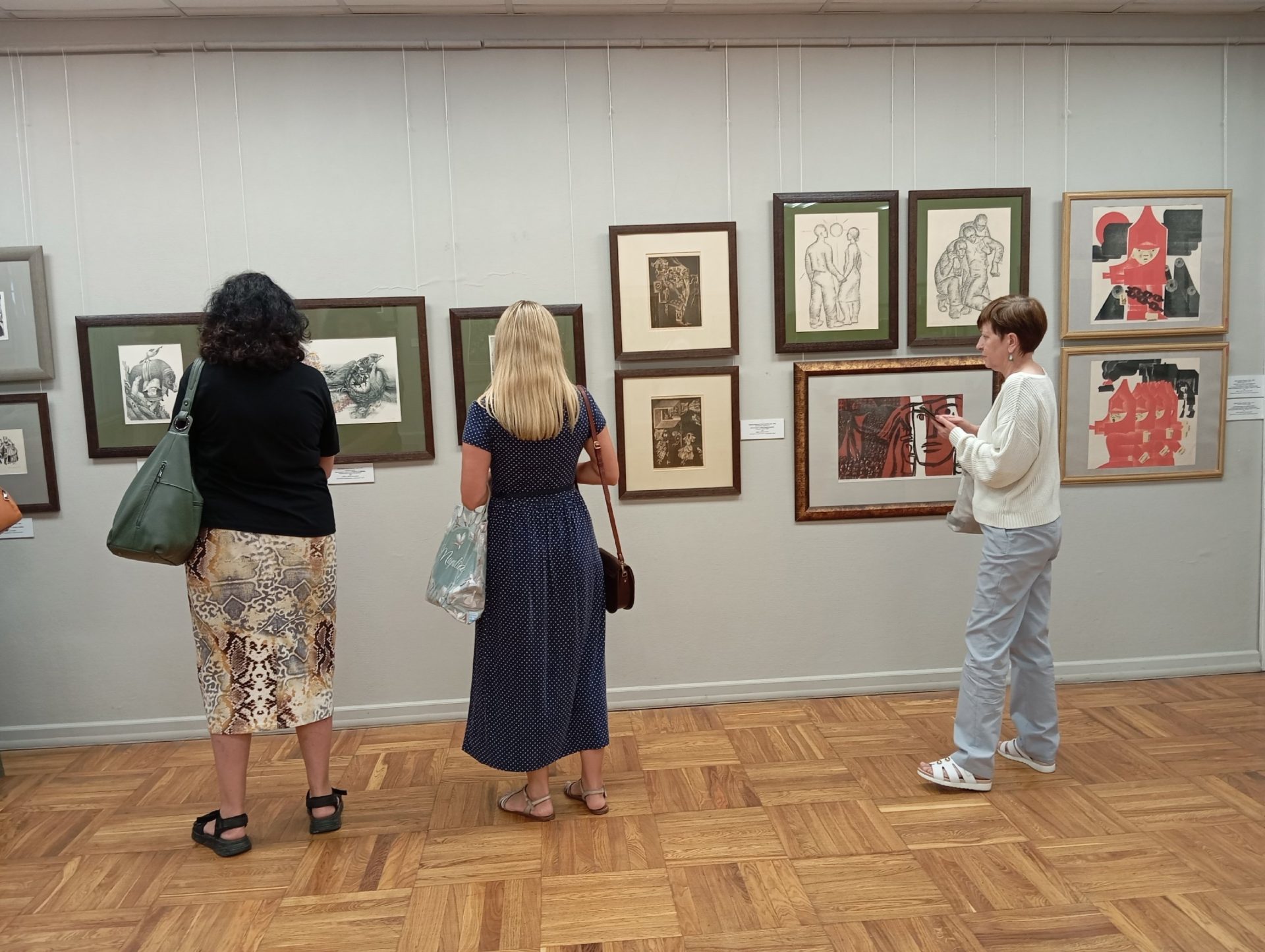 Экспозиция включает пять тематических блоков, каждый посвящен определенной технике: ксилографии, линогравюре, офорту, литографии и оригинальной графике.