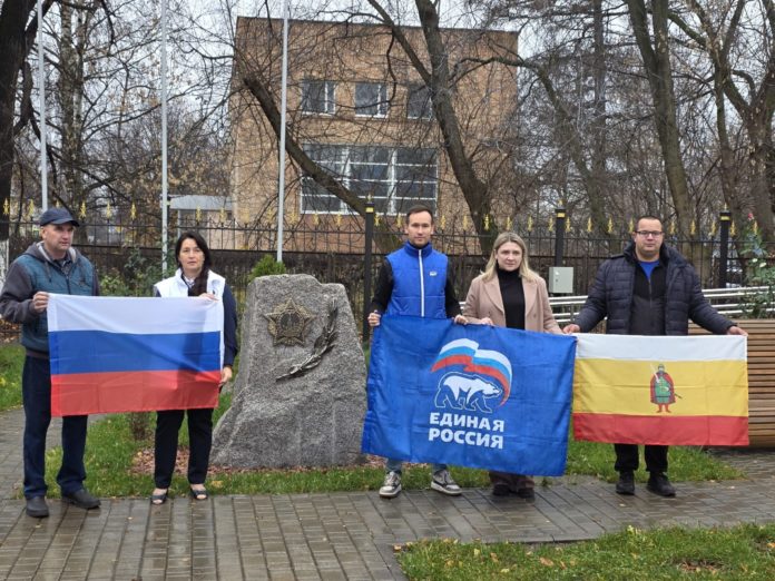 Перед посадкой в автомобиль волонтёры по традиции делают снимок на память с флагами России, партии «Единая Россия» и Рязанской области у мемориального знака «Орден Победы».