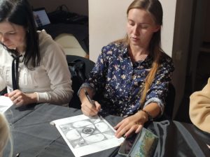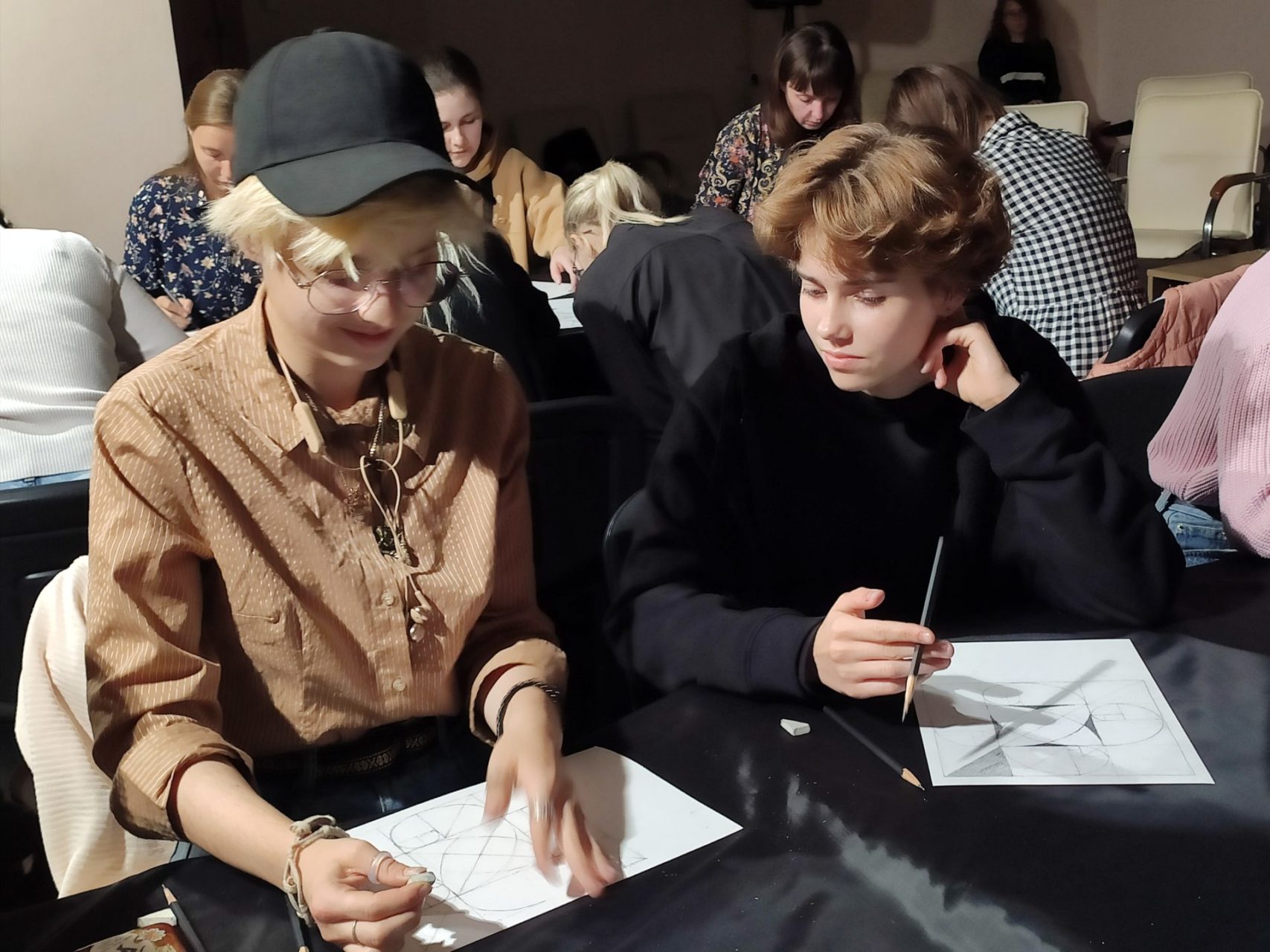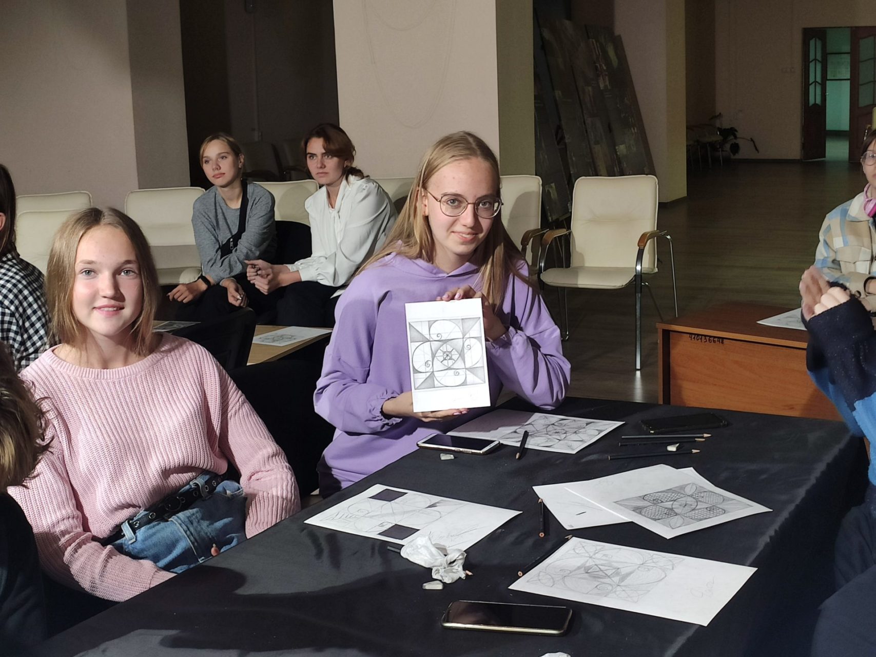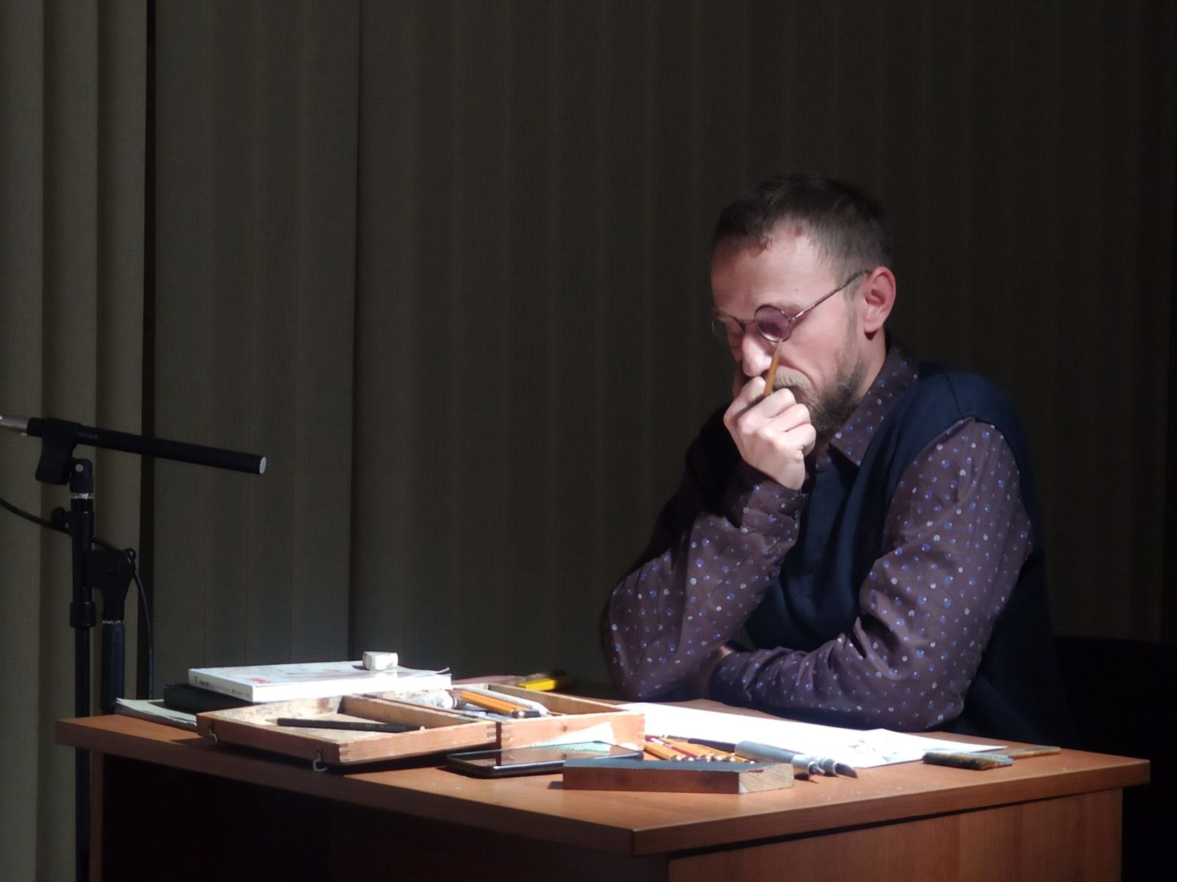 Приятная музыка и неторопливые штрихи на бумаги помогли гостям расслабиться и забыть будничные заботы. Член Союза художников России Денис Валерьевич Чернов рассказывал о построении плоских форм на бумаге, осях и внутреннем чувстве пропорциональности.