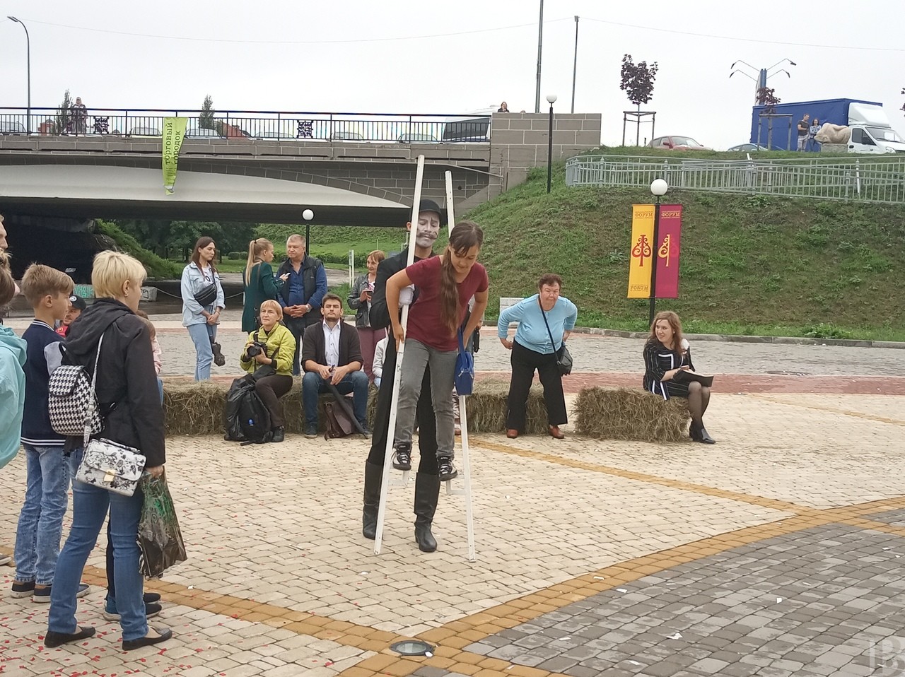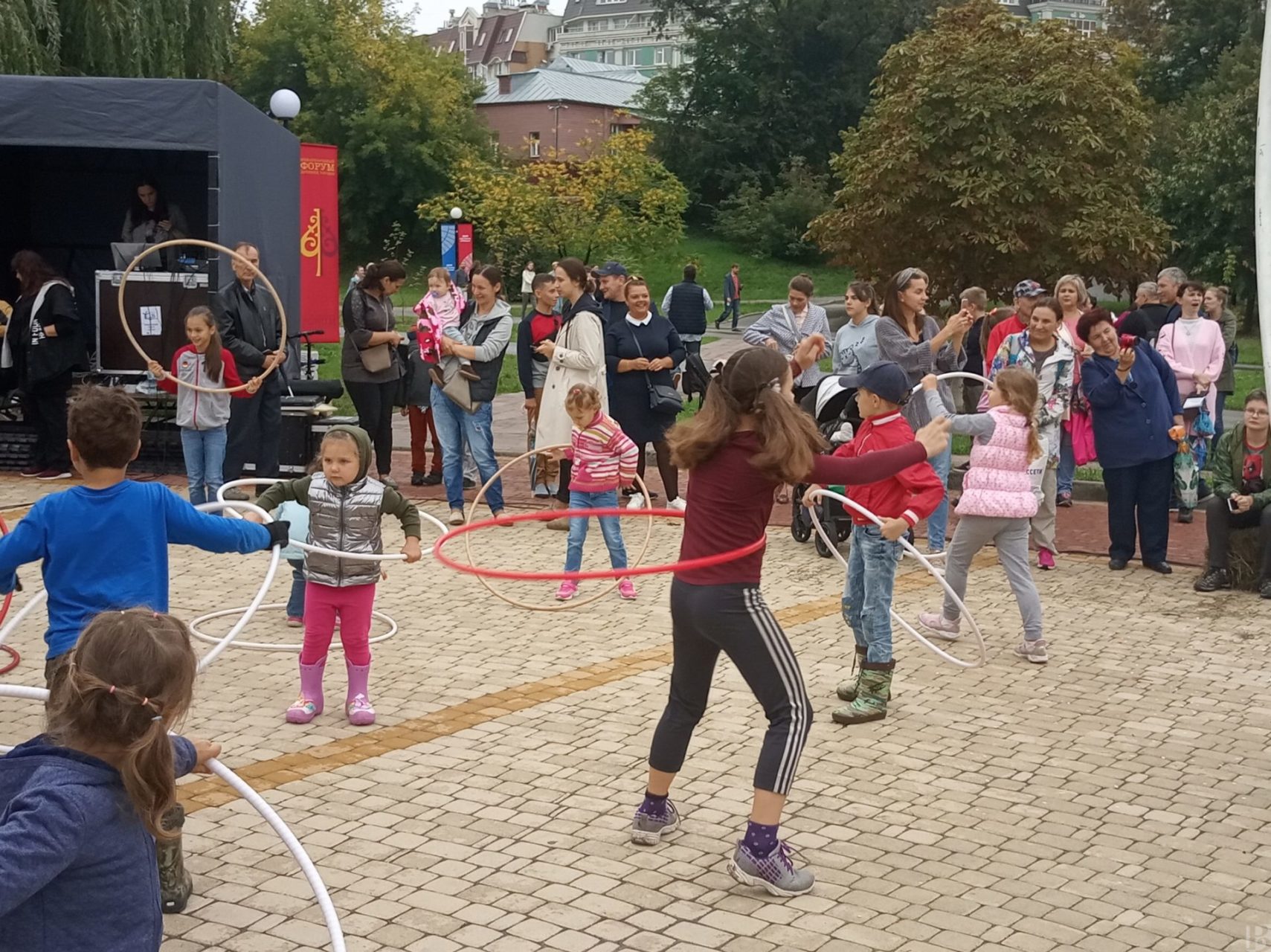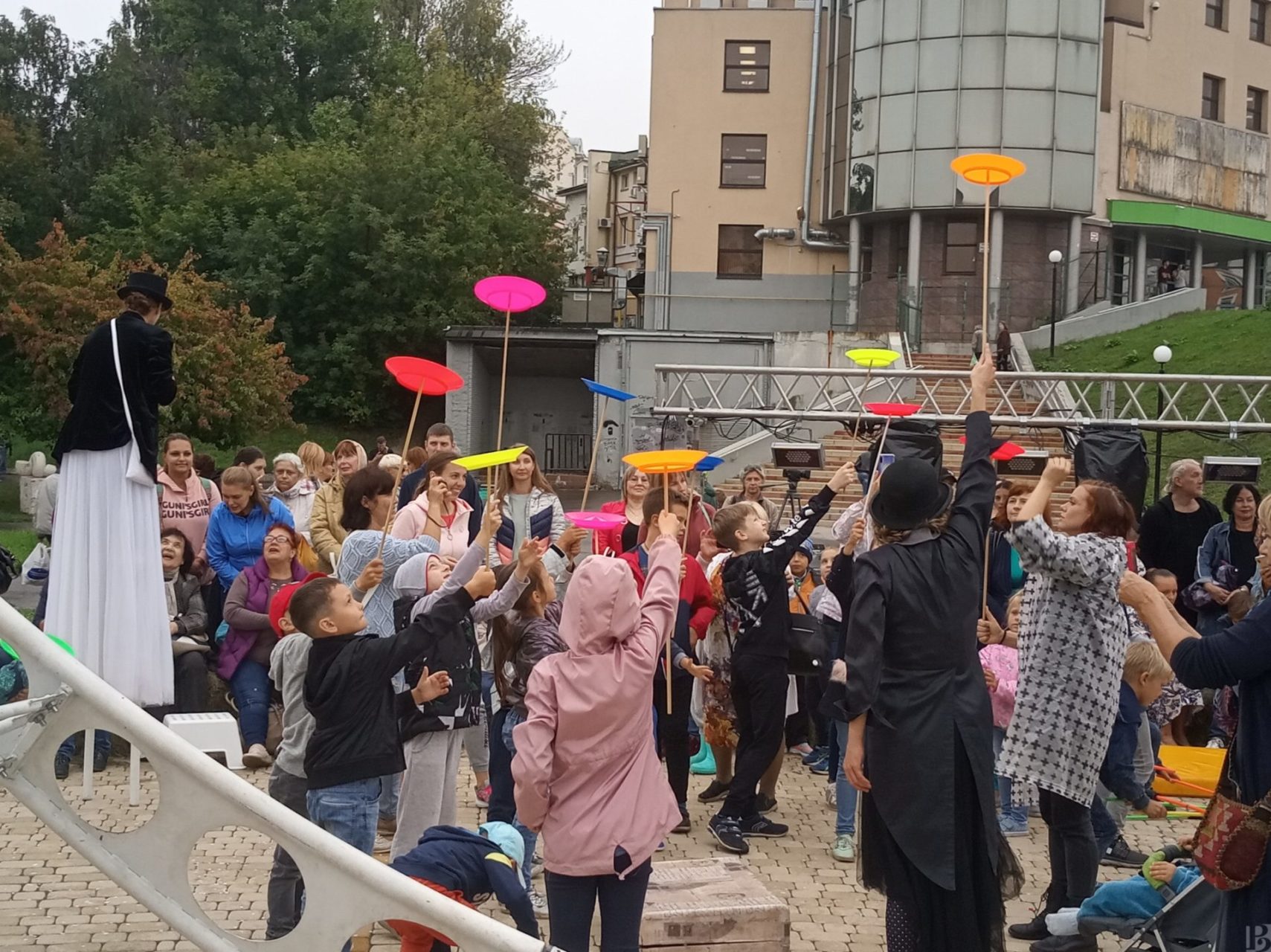 Профессиональные актеры учили смельчаков ходить на ходулях, крутить тарелки на палках и вращать обруч.
