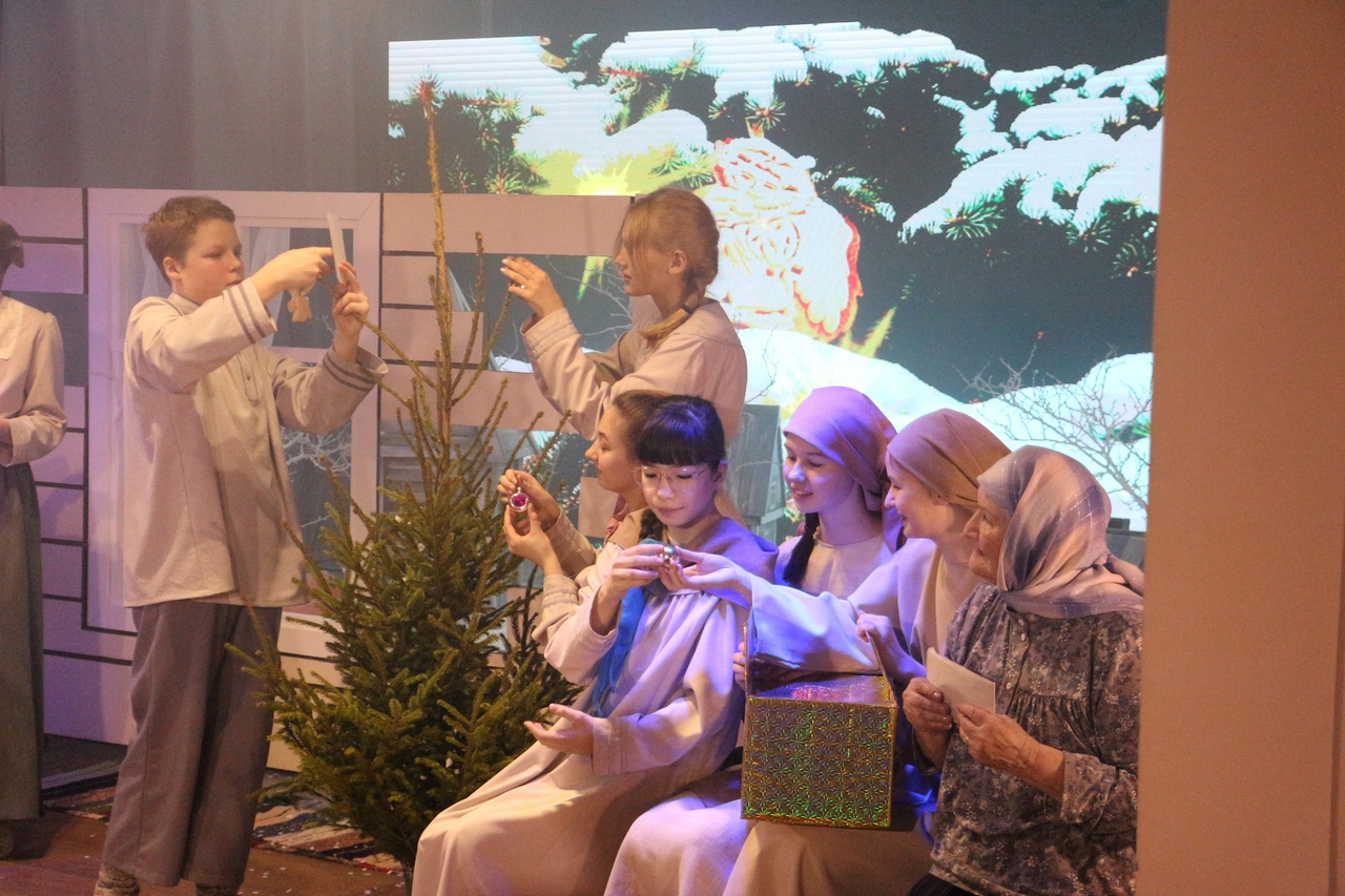 Театральное действие погрузило зрителей в атмосферу истинно русских традиций празднования Светлого Рождества: со сцены звучали народные песни, артисты водили хороводы. Каждый присутствующий смог увидеть мир старинных обычаев и понять, как наши предки готовились к встрече Рождественской Ночи, которая испокон веков является живым повторением события, когда Ангелы воспели славу рождению Христа, а волхвы принесли младенцу драгоценные дары.