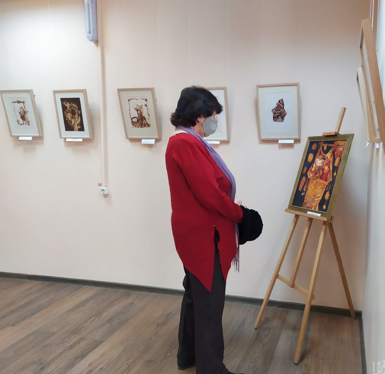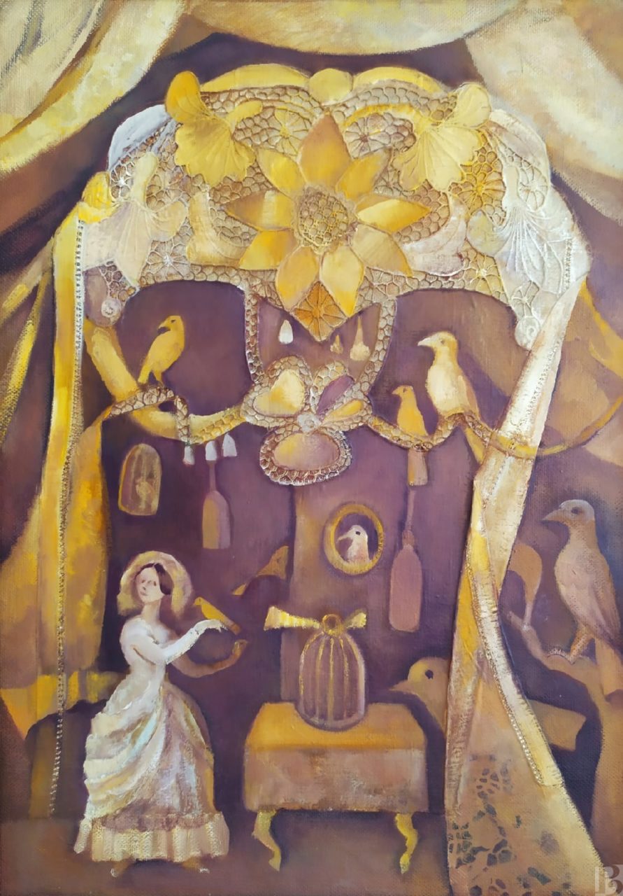 В работах выставки встречаются и графичные детали, и все многообразие живописных техник, и даже элементы декоративно-прикладного искусства. К примеру, в нескольких полотнах использованы фрагменты кружевной материи, которые выглядят частью общей истории. На каждой из картин можно увидеть и сказочные сюжеты, и вполне реалистичные сцены, которые оставляют ощущение театральности и “зазеркалья”. Кроме того, во многих работах прослеживается тема неумолимого времени, которое никого не щадит. Особая часть выставки – коллекция авторских кукол в костюмах разных стран и эпох.